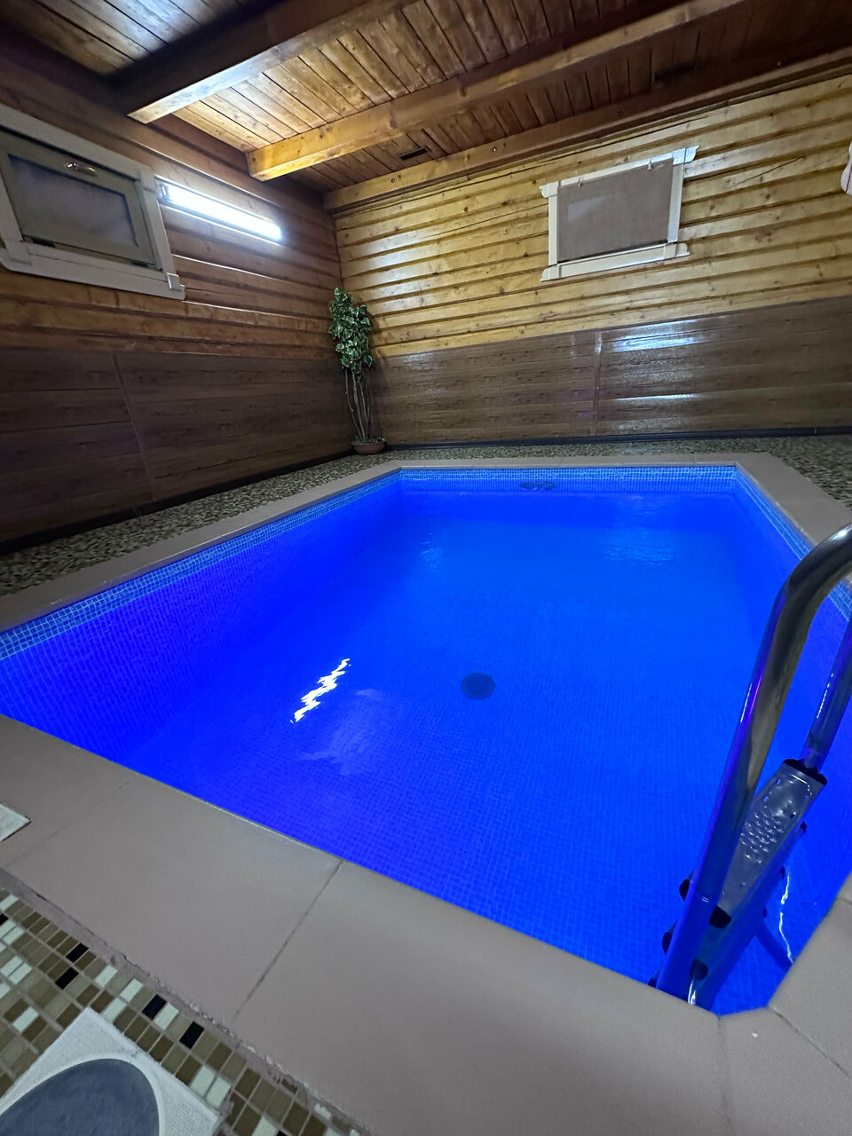 Очень просторная баня с хорошим интерьером. Парилка — парит. Раньше времени баню не отключают, так что жар до самого конца. Бассейн без бортов, напольной — залазить никуда не надо. Только вылазить)