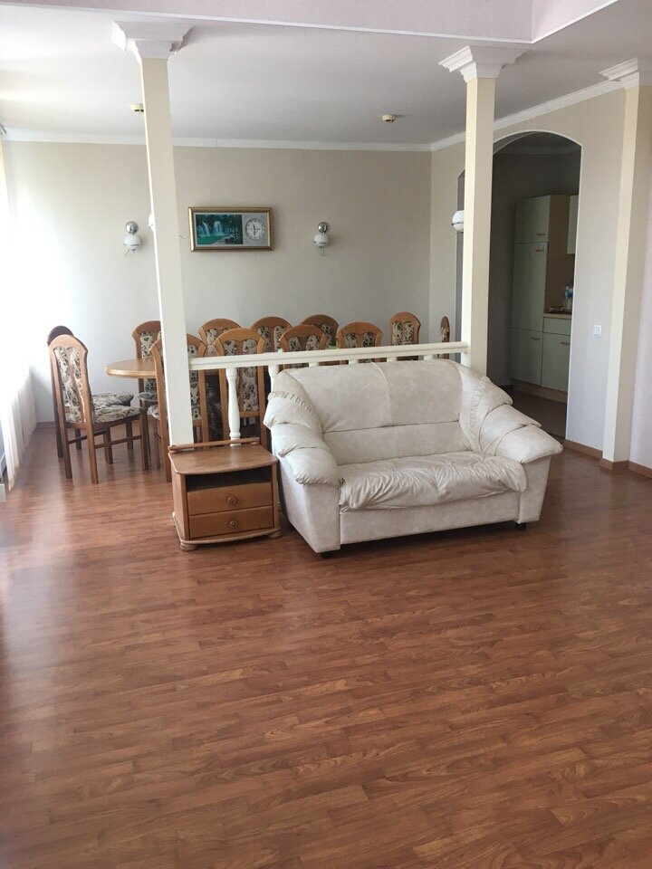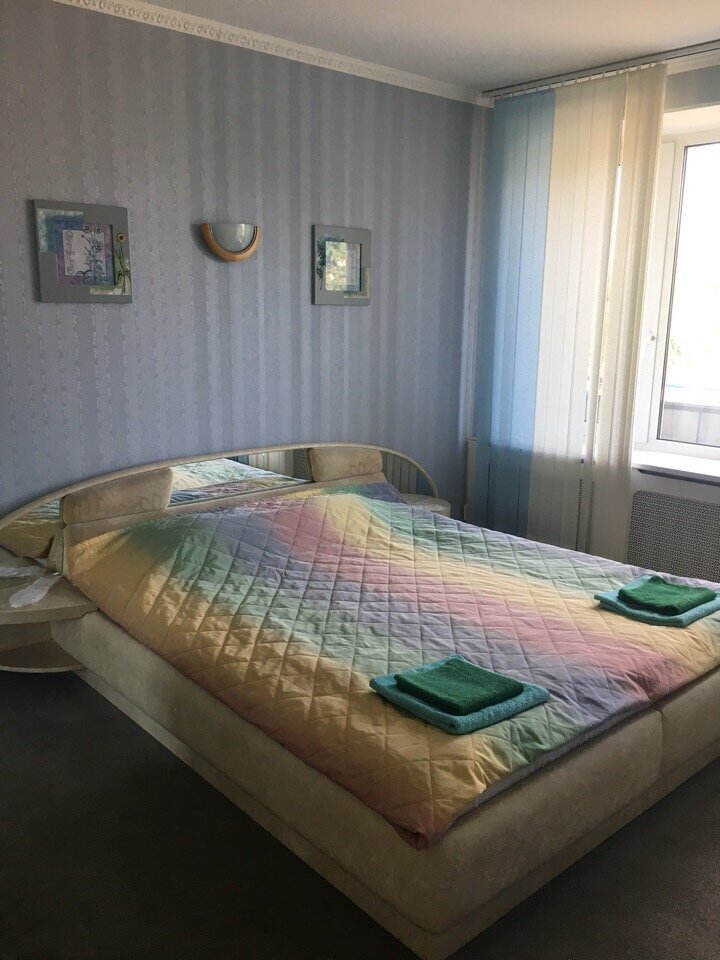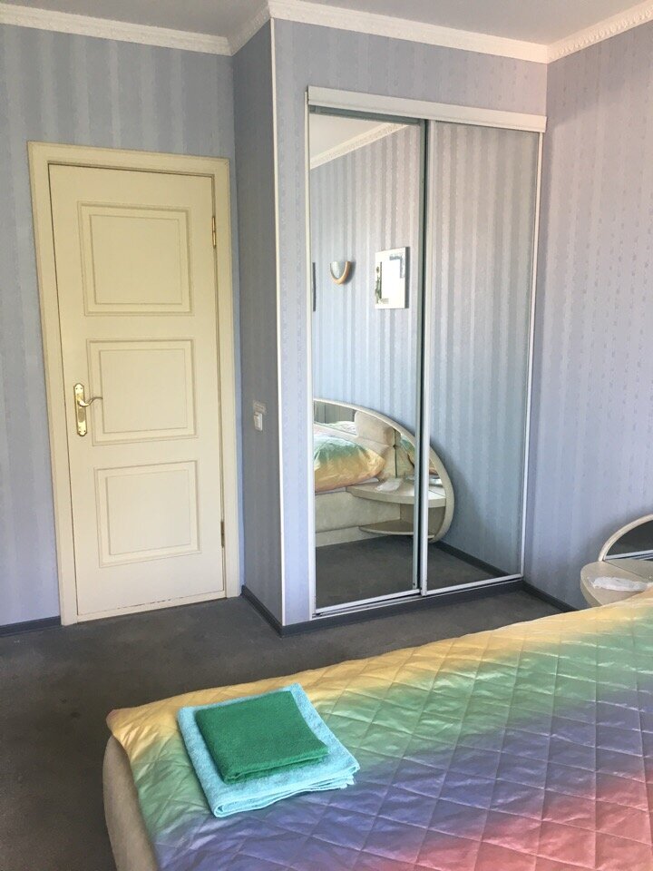 4 спальных места, шкаф платяной- 2, стол обеденный, стулья, тумбочки, зеркало, 1 телевизор, холодильник, санузел совмещенный с душем, балкон
