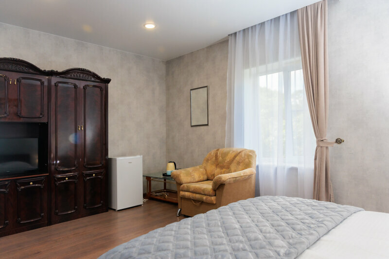 Оснащение: кровать двуспальная 160*200 с матрасом, два кресла, столик, LCD телевизор с цифровым телевидением, бесплатный бесплатный Wi:Fi, эл. чайник, мини-холодильник, вентилятор, зеркало, шкаф для одежды, тапочки, фен.