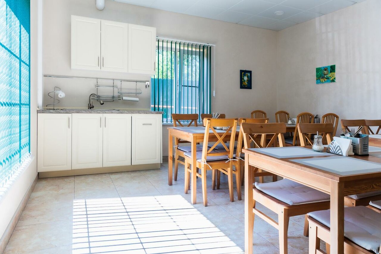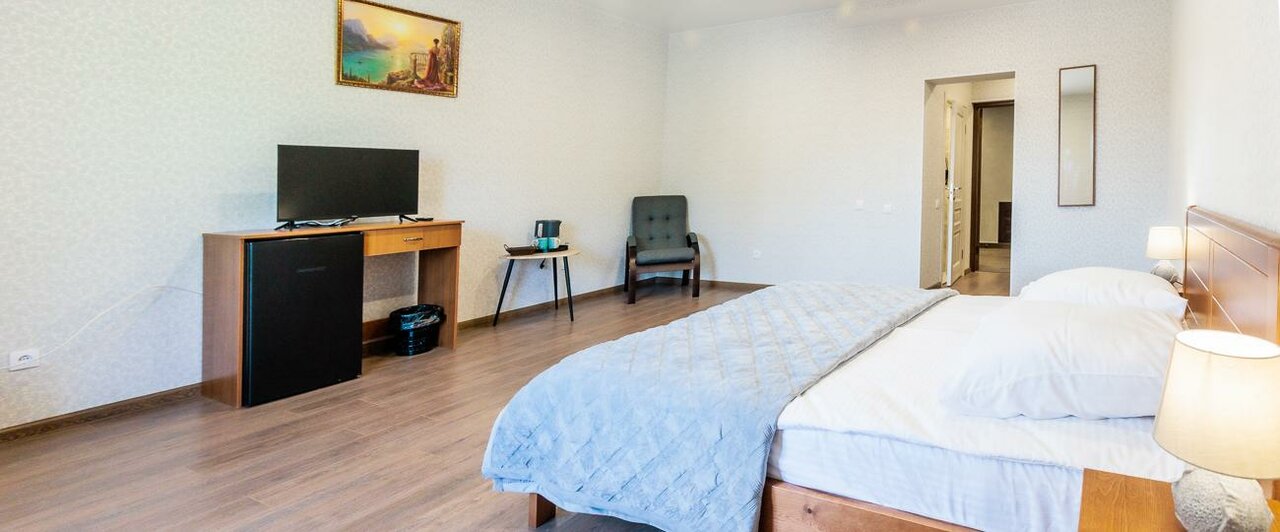 - Уютная, домашняя атмосфера.; Просторные и удобные номера.; Возможность приготовить еду самостоятельно.; Тихая и спокойная обстановка.; Кондиционер, холодильник, телевизор в номере.