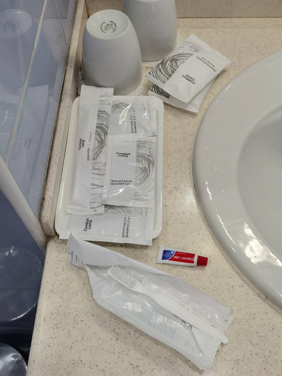 - Наличие тапочек, зубной пасты, щётки, геля и шампуня.