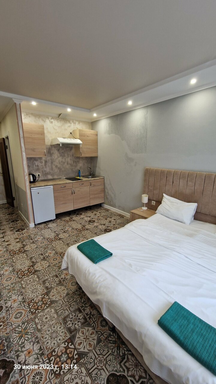 Ужасный сервис: предварительно написала, что приеду в 13:00, по итогу, в 13:20 номер даже не убрали, попросили подождать ещё 10 минут. В итоге заселили только в 13:30. Сесть негде, мы с дороги, уставшие ждали. Что получили: ужасная грязь в душе: волосы, остатки гигиенических сред, я думаю, может ещё что. Кухня вся непромытая жирная и в подтеках, на унитаз можно сесть только если в 10 слоев его обложить бумагой, но лучше не рисковать. Также впитавшийся запах сигарет в душе. Кран в душе еле держится, ручка у шкафа отсутствует, вместо нее привязан пакет. Слышимость ужасная. Из плюсов- только тепло в номере. Приходили только переночевать, но пользоваться как душем, так и кухней было противно. Вообще никому не советую.