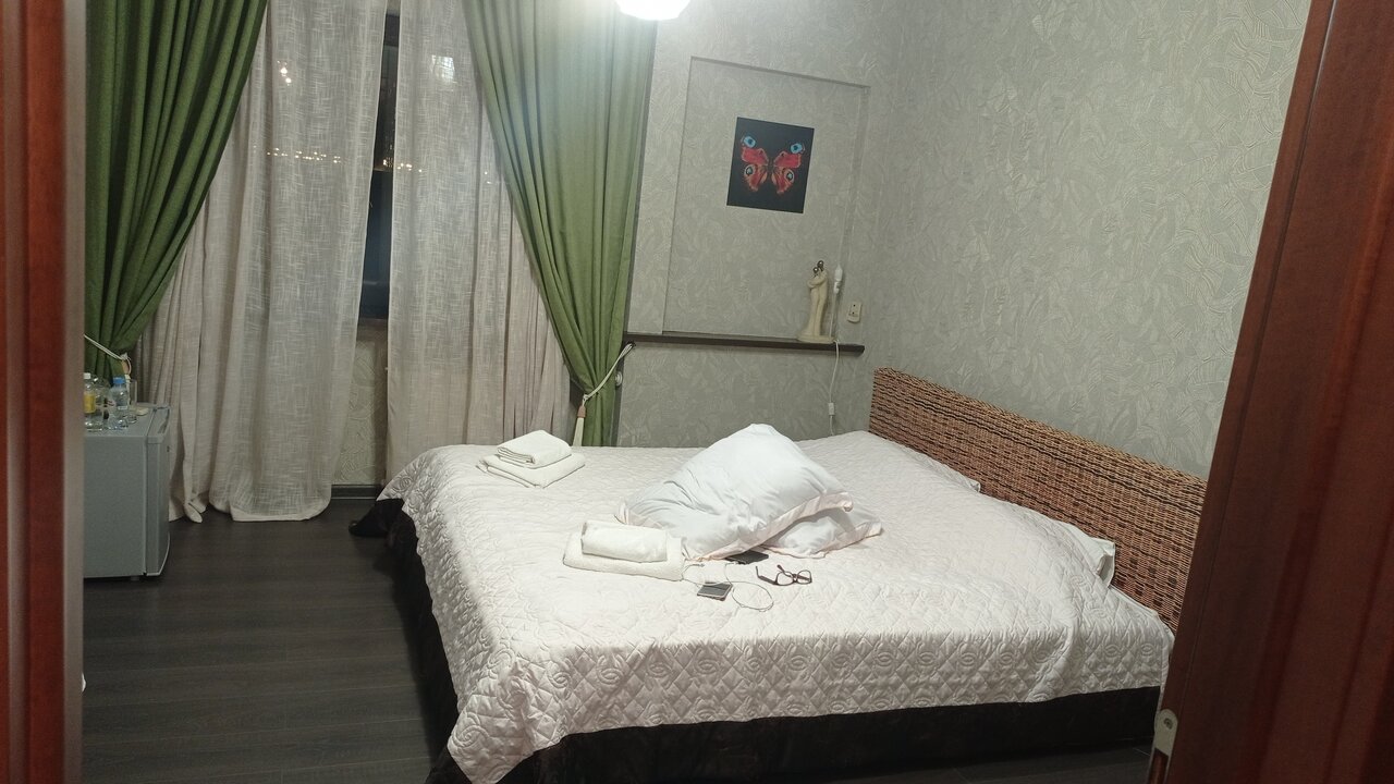 Удобства: — Номера с кондиционером, холодильником, телевизором, Wi-Fi, феном, утюгом. — Бесплатная парковка, общий туалет, прачечная. — Мини-отель с камином, террасой, площадкой для пикника. — Баня, халаты, тапочки. — Кафе и ресторан, банкетный и конференц-залы. — До центра города — менее 3–5 км.