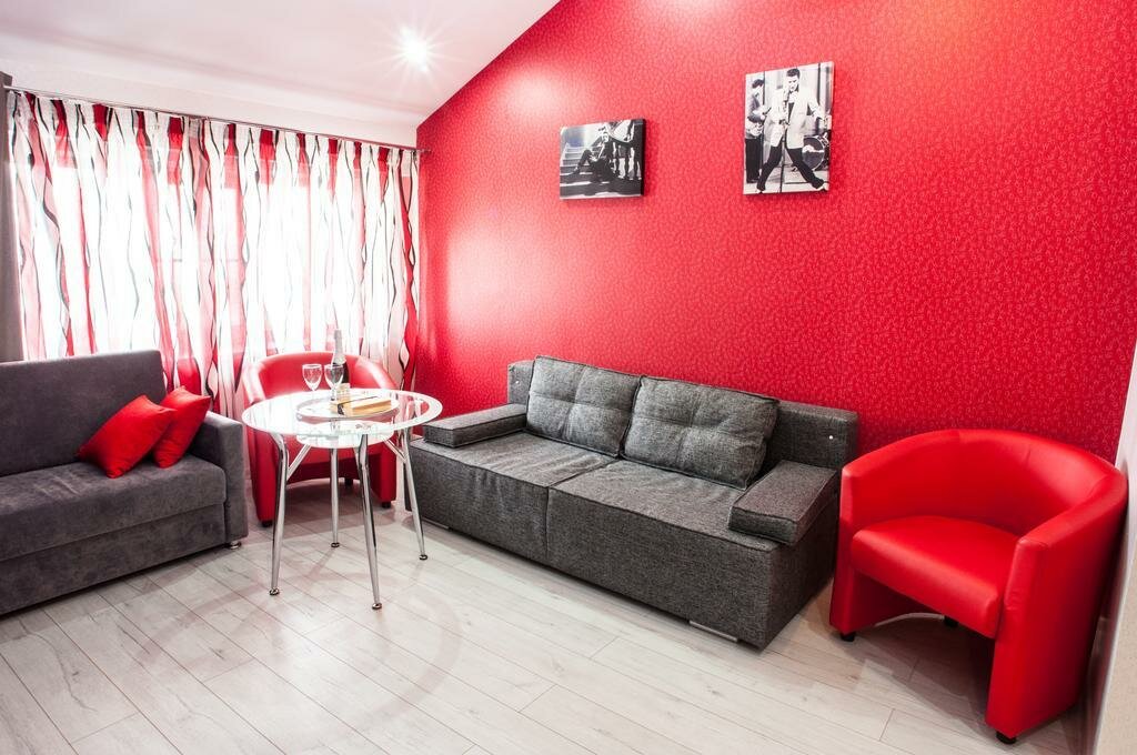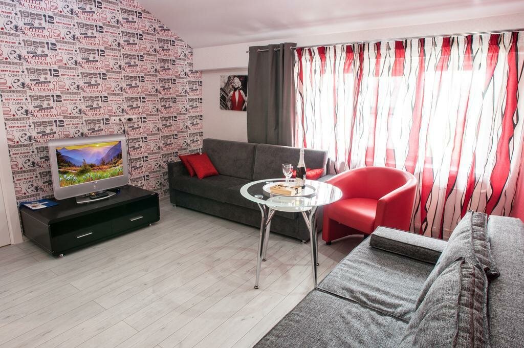23 комнаты. Широкая двуспальная кровать или две односпальные кровати с ортопедическим матрасом, диван, гостиная, обеденный стол, кухня с микроволновой печью и набором посуды, кофе-машина, журнальный столик, стул, шкаф, телевизор, мини-холодильник.