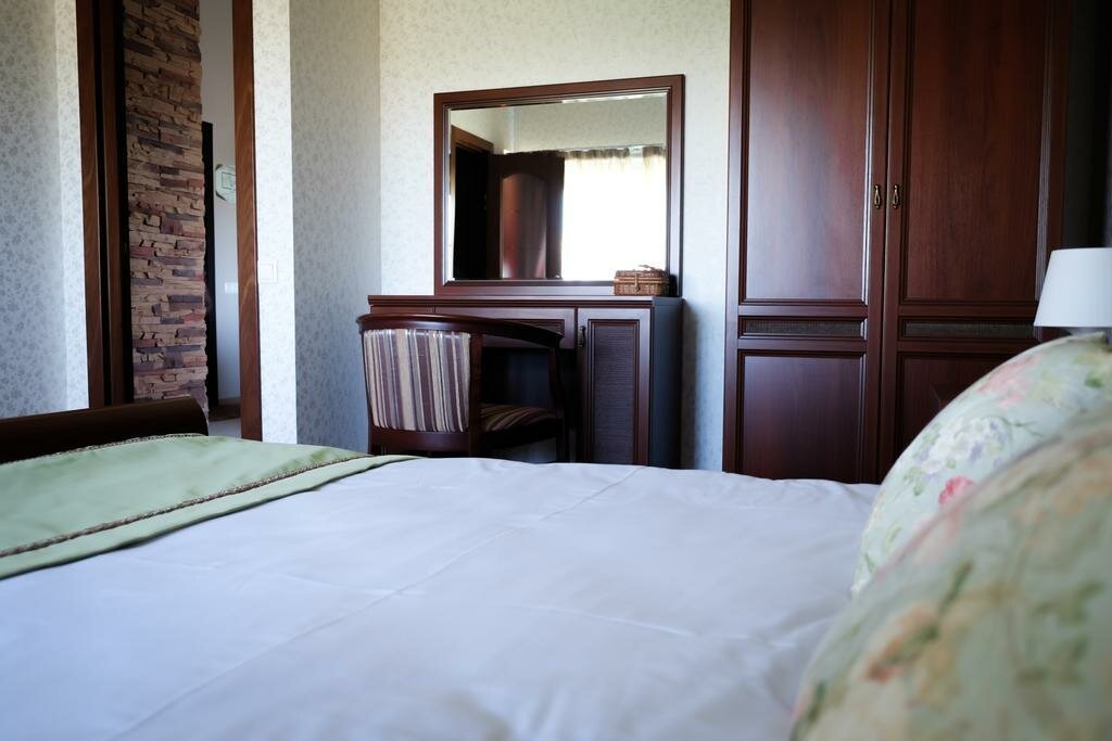 В номере широкая двуспальная кровать или две односпальные кровати с ортопедическим матрасом, журнальный столик, стул, встроенный шкаф, телевизор, мини-холодильник.