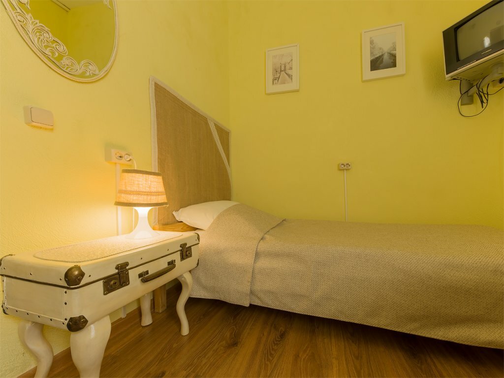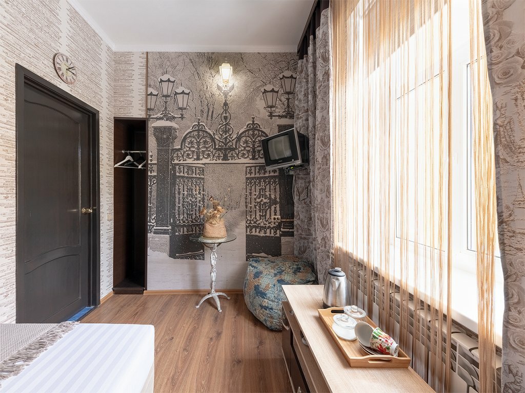Бюджетный номер с односпальной кроватью, прикроватной тумбочкой, кофейный столик. Удобный стул. Полки для одежды. Телевизор. Общий санузел. Общая кухня.