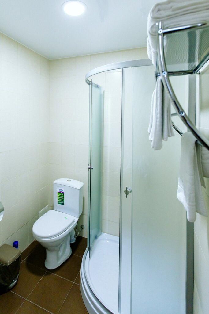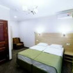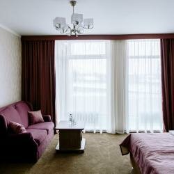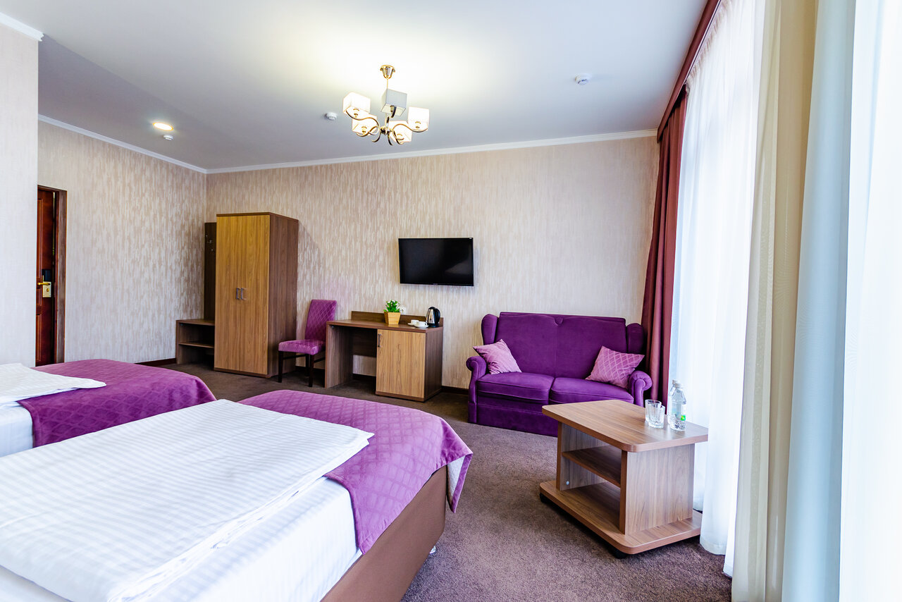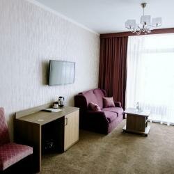 Однокомнатный двухместный номер, площадью 24 кв.м.В номере одна двуспальная кровать; кресло-кровать;телевизор с плоским экраном; холодильник; сплит-система; ванная комната с зеркалом для макияжа (душевая кабинка,туалет); туалетная косметика, махровы