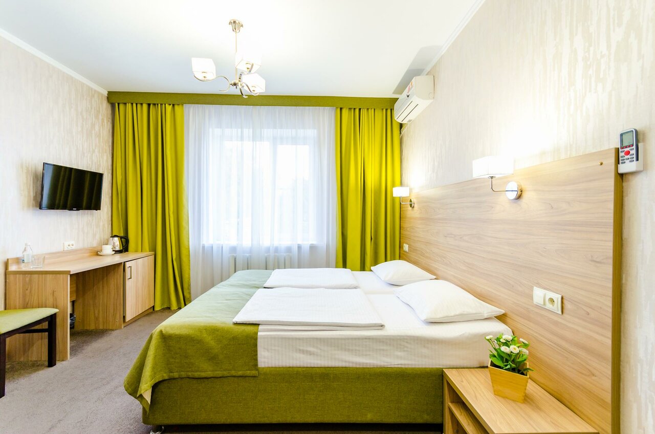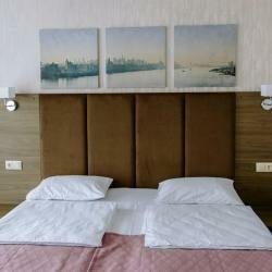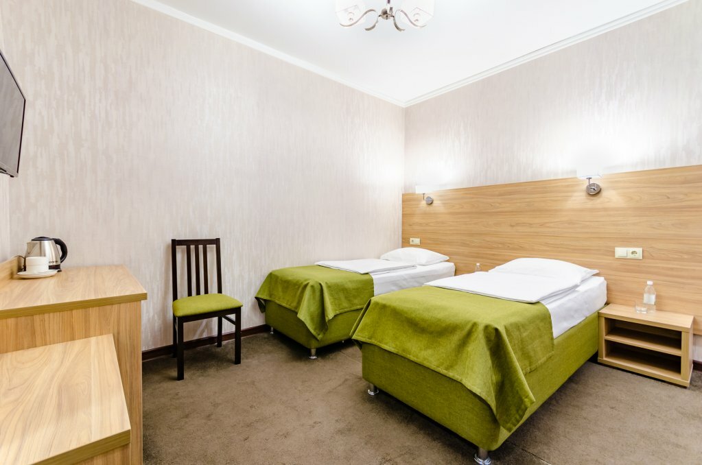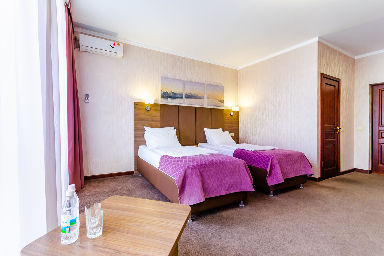 Однокомнатный двухместный номер, площадью 25 кв.м.В номере две полуторные кровати; телевизор с плоским экраном; холодильник; сплит-система; ванная комната с зеркалом для макияжа (душевая кабинка,туалет); туалетная косметика, махровые белоснежные пол