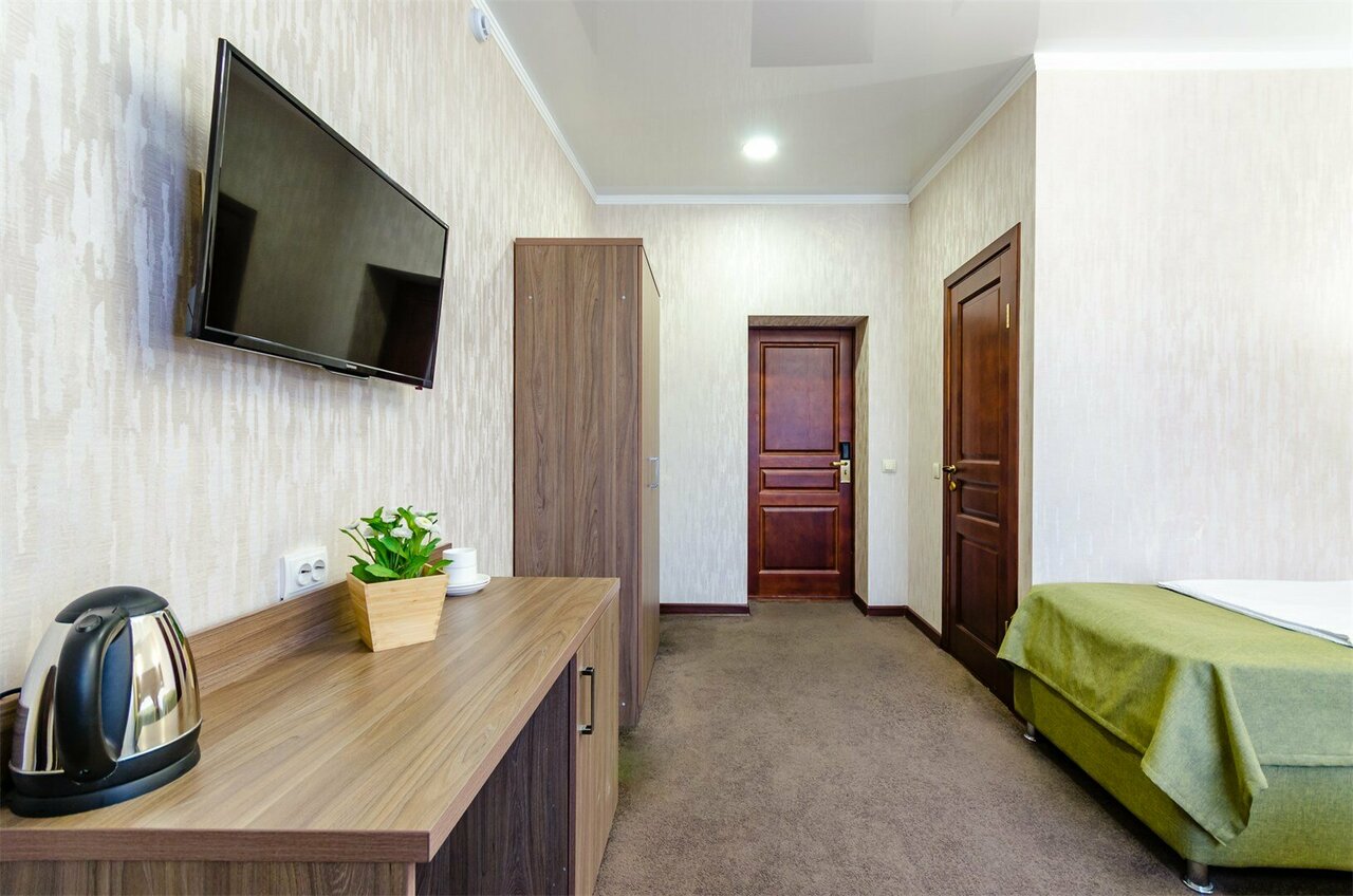 Однокомнатный двухместный номер, площадью 22 кв.м.В номере две полуторные кровати; кресло-кровать; телевизор с плоским экраном; холодильник; сплит-система; ванная комната с зеркалом для макияжа (душевая кабинка,туалет); туалетная косметика, махро...