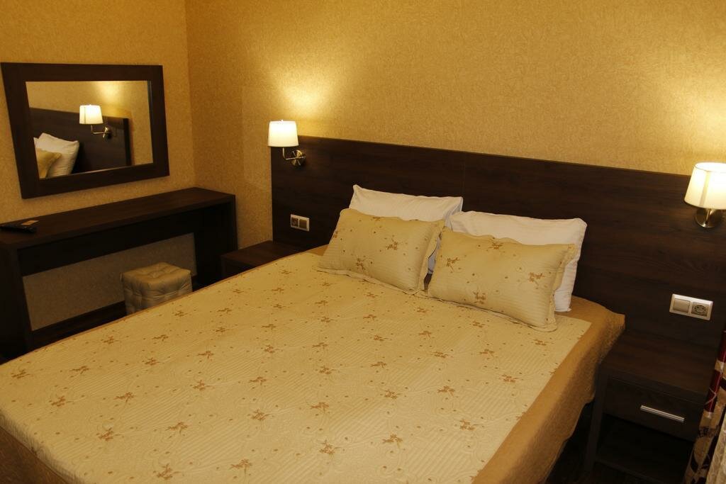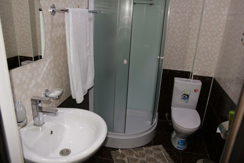 Из плюсов: Удобное расположение, в номере чисто, есть халаты,тапочки, разовые мыльно-рыльные принадлежности (мыло, шампунь, зубная паста, щётка, гель), фен, графин, стаканы, холодильник, кондиционер, в шкафу лежат тёплые одеяла. Без проблем нас заселили в 4часа утра. Завтрак мы не стали заказывать, так как не знали во сколько уедем. Из минусов: Нет действующего кафе при отеле. Душевая кабинка маленькая, стекла все в разводах и извястковом налёте , в кабинке некуда положить кусок мыла или шампунь, нет отдельного полотенца для ног.