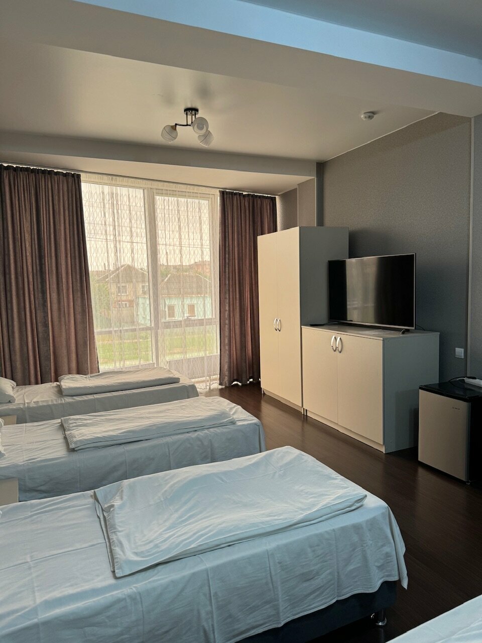 Номер 4х местный,номера со всеми удобствами: Телевизор, холодильник, сан.узел, сплит.система. В номерах есть одноразовые тапочки ,одноразовые щётки , мыло, шампунь, вай-фай . Информацию уточняйте по номеру телефона