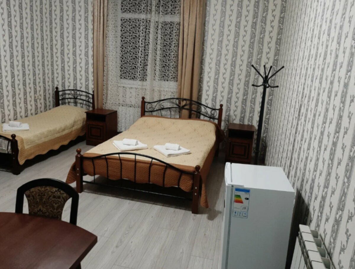 Комфортабельный номер на 3 человек, две односпальные кровати(по запросу ставим вместе) и дополнительное спальное место, собственный су, тв, холодильник, стол.