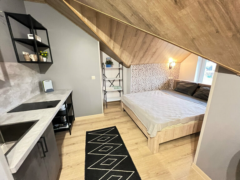 Функциональные и комфортные номера категории 'Смарт' подойдут для размещения командировочных гостей и сольных путешественников.В спальной зоне находится двуспальная кровать с высоким ортопедическим матрасом, кухонная зона оснащена все