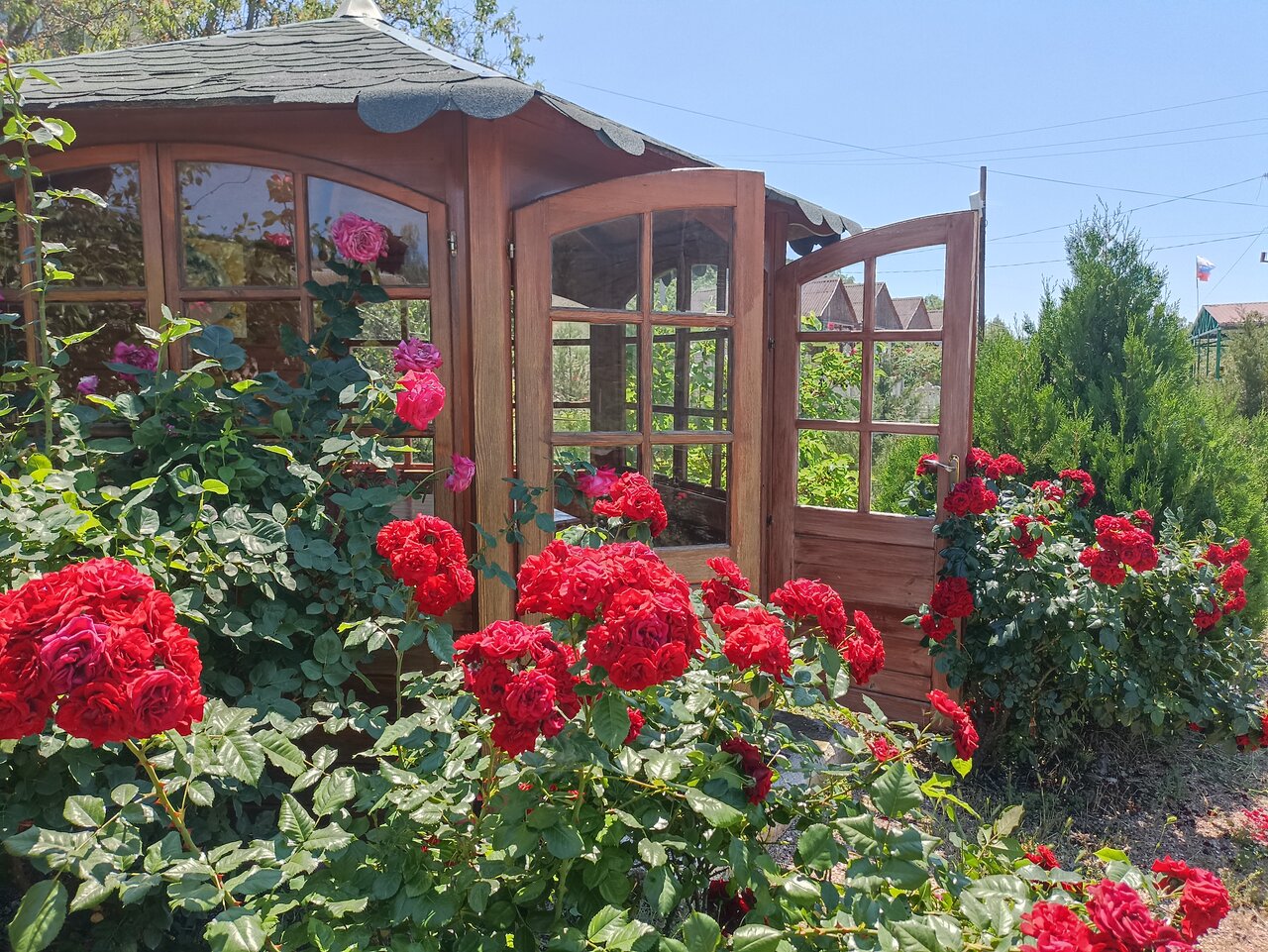- Большая территория с беседками, лавочками.