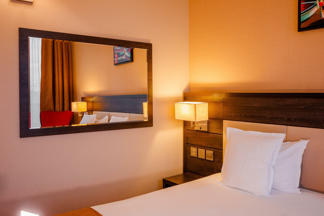 В номерах почти все хорошо и стандартно, но есть два обстоятельства которые не позволяют поднять оценку, а именно: у меня в номере из окна дуло ветром просто ужас (но это мелочи )так как завывание было такое сильно что пришлось 3 ночи спать с подушкой на голове, и еще момент при заселении в визуально чистом туалете пахло мочой и с этим запахом я прожил две недели. Благо что в номер приходил только спать. И чуть не забыл самое главное, каждую пятницу, субботу, про воскресенье не помню, ресторан арендуют под разные гуляния и музыка орет до 23:00 и бывает и дольше конечно. Вот лежишь и слушаешь это веселье и думаешь слава богу эта командировка за счет компании и номер у тебя на 4 этаже, а не на втором, так как за свой счет слушать чью то музыку и проходить мимо гулящей компании то еще удовольствие.