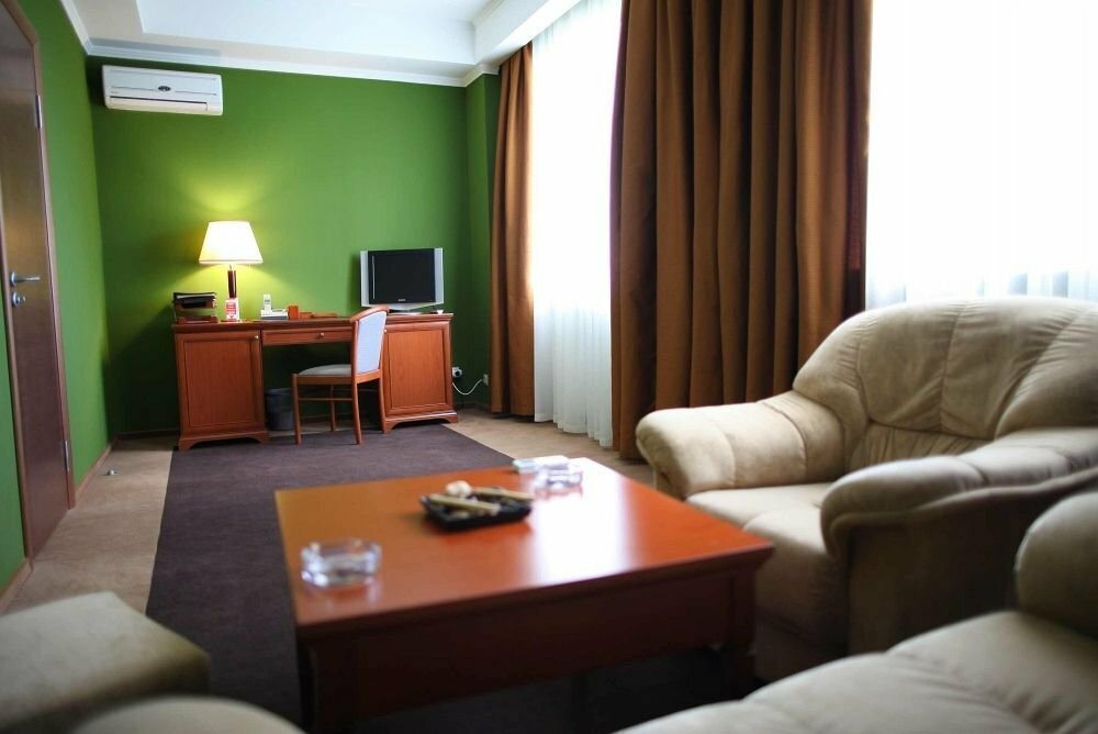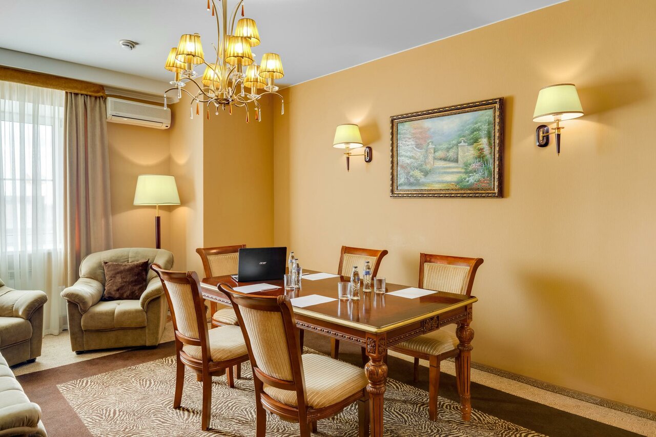 Интерьер: старенький отель из начала нулевых. В номерах прохладно, сушилка в ванной не работает, ванная выглядит вычурно. На лестнице много фотографий со звёздами, которые когда-то останавливались. Из номеров вид или на дорогу, или на какую-то стоянку. Обслуживание: средне. Не хамят, но и большой любезности нет. За глажку костюма взяли 1000 руб, хотя в прайсе было написано 100 Питание: сам ресторан хороший. Но шведский стол никакой — на выбор около 4 горячих блюд + хлопья