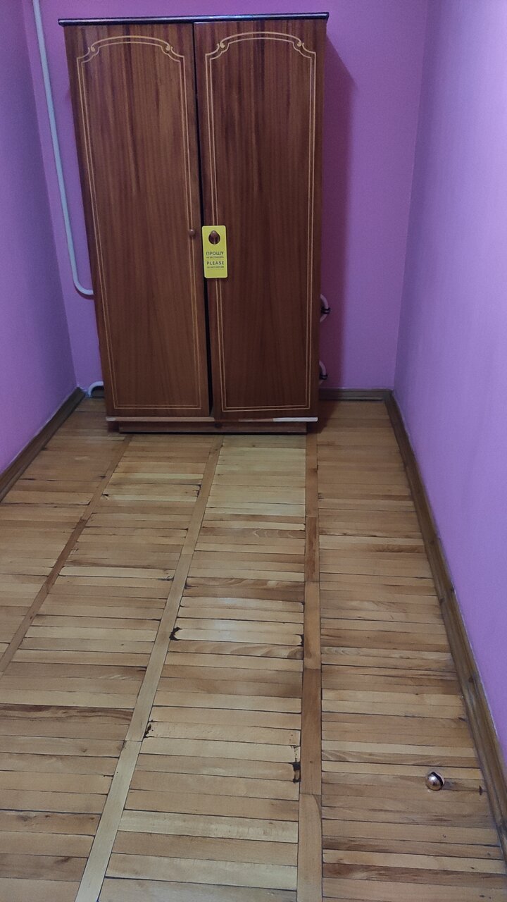 Ночлежка. Пол — паркет, 30 летней давности. Кровати-ужасные, матрасы-ещё хуже, пружинные блоки уже давным-давно пора сменить. Оконные рамы-это просто ужас, деревянные крашенные, я такие последний раз лет 30 назад видел, когда нашу коммуналку расселяли. Санузел тоже ужас, лейка в душе льёт в разные стороны, унитаз установлен так, что коленями упираешся в стену.