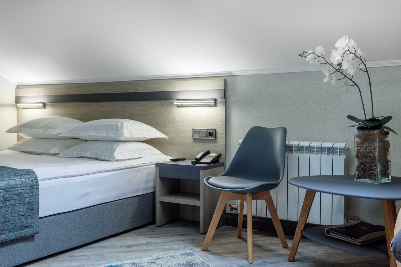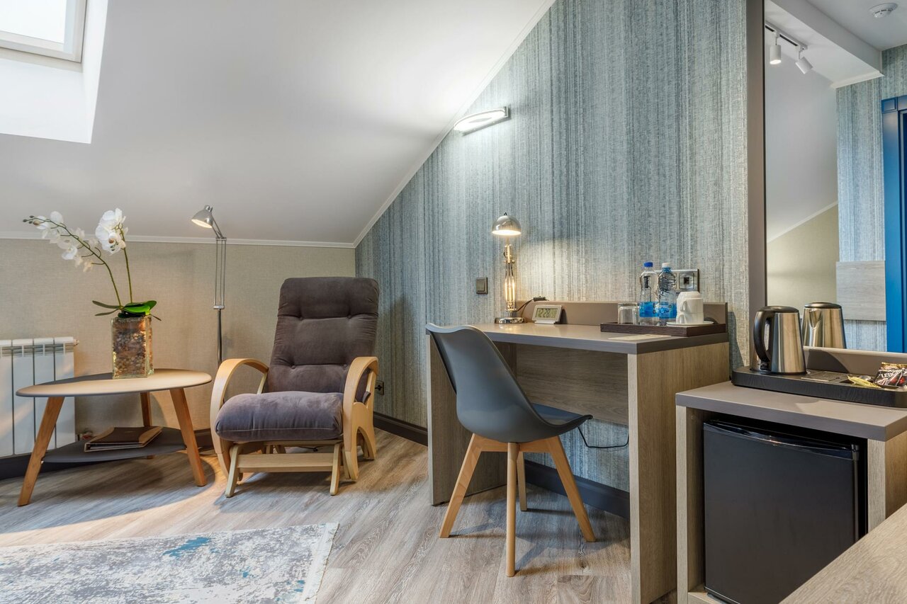 Хорошая гостиница, вкусные завтраки. Есть небольшой тренажёрный зал (гантели, турник, брусья, беговая — отличные. Велосипед не работал). Номера бывают разные, но один из видов — с мансардой (скошенная крыша). Вот они не очень удобные для человека ростом 180 см. Я несколько раз головой в эту скошенную крышку входил