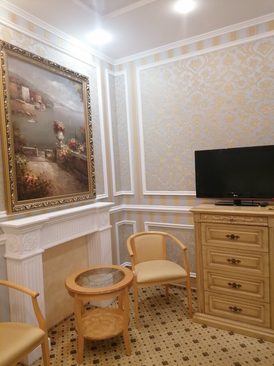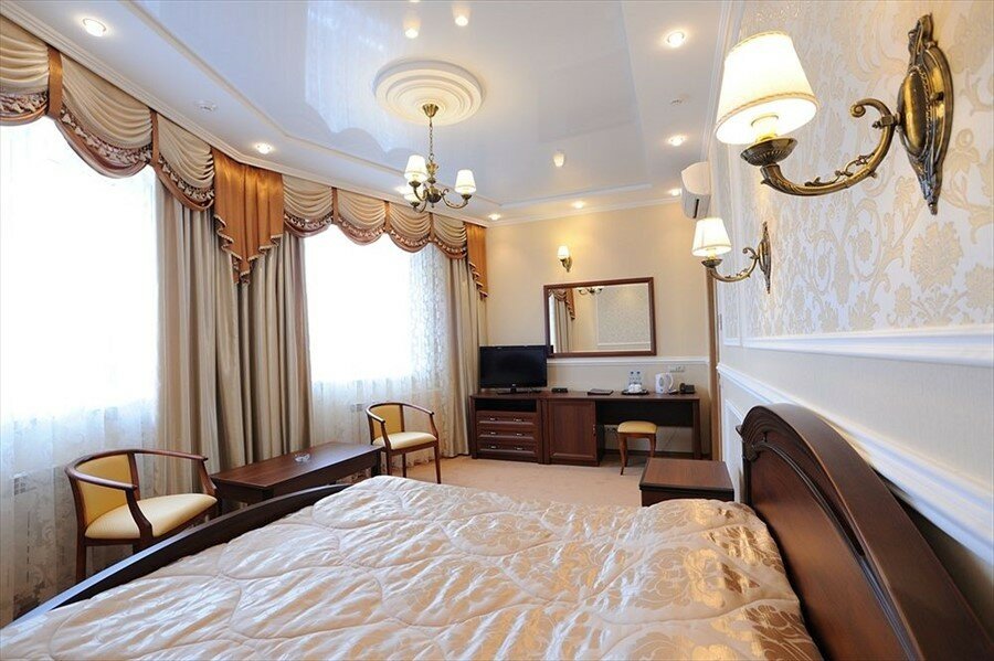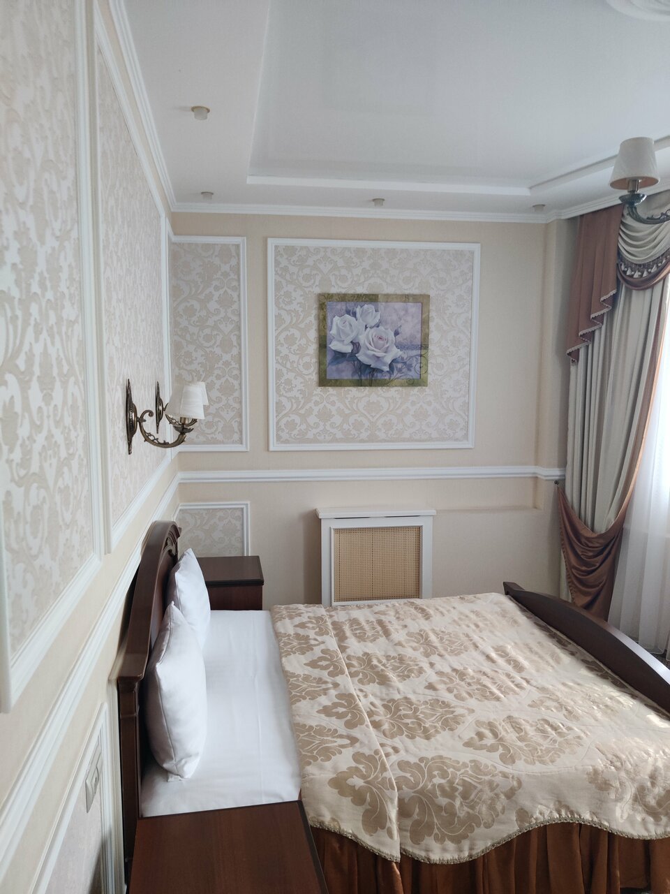 Останавливались в люксе за 5000. За такие деньги могло быть и лучше. Номера в классическом стиле. Большая кровать, но матрасы твердые, спать неудобно. Есть фен, вай-фай, телевизор, чай-кофе, бар. При отеле есть ресторан. Завтраки большие, но тоже с вопросом: принесли хлеб с волосом, вскрытые сливки. Однако, извинились и дали десерт (на 3-ку). Паркинг свой, но от него придется идти с чемоданами метров 100. Персонал приветливый. Вполне неплохо, но за 3500. Полы в душе скользкие, номер маленький.