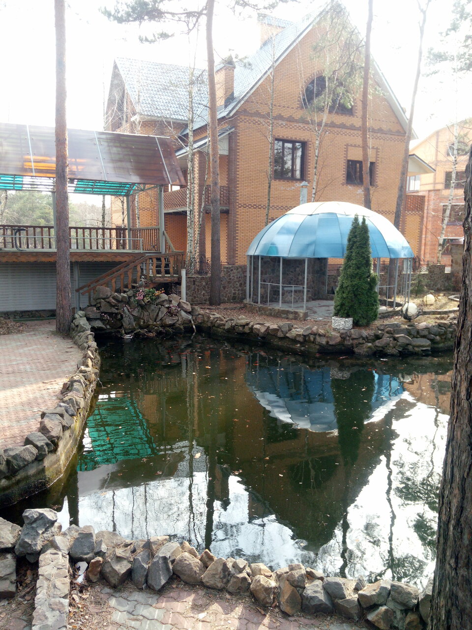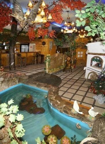 Место произвело неоднозначные впечатления. 1. внешняя сторона. Огромная прилегающая территория. 10 (минимум) беседок, чтобы шашлык пожарить. Прудик с рыбками, водяное колесо (правда поломанное), прудик с утками… 2.внутри пафос. бильярдные столы у рессепшн, хрусталь, колонны. Отдельная классная задумка с обеденной частью. Антураж ‘деревенский стиль’ с псевдопечками, горшками и керосинками. Уютно. И там тоже журчит фонтанчик с рыбками 3.Номер (однушка) это лопата дегтя. Или мешок с …. Во-первых холодно. Во-вторых электрику МЕНЯТЬ!!! СРОЧНО!!!!. Розетки вываливаются из гнезд. В-третьих мебель. Теоретически у тумбочки должны быть дверцы. а у шкафа нижняя створка двери не болтаться внизу (шкаф-купе). Убитый номер. И отдельно убила ванная. Там даже не китайская душевая кабинка. а корыто с занавесками. Фотку с корытом прикрепил. красивые не буду, они и так есть.