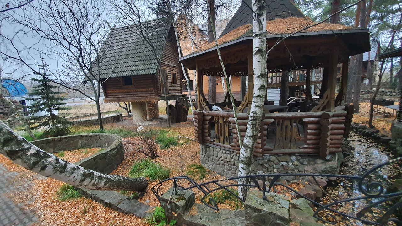 Насколько я поняла,находится на окраине города. Хорошее расположение. Много беседок и куполов,где можно отпраздновать своё торжество. Красиво сделаны дорожки,пруды с рыбками,дорожки,водная мельница. По блюдам нареканий нет-вкусно.Главный недостаток — маленький уличный туалет на всю территорию. В выходные очереди, особенно в женский.