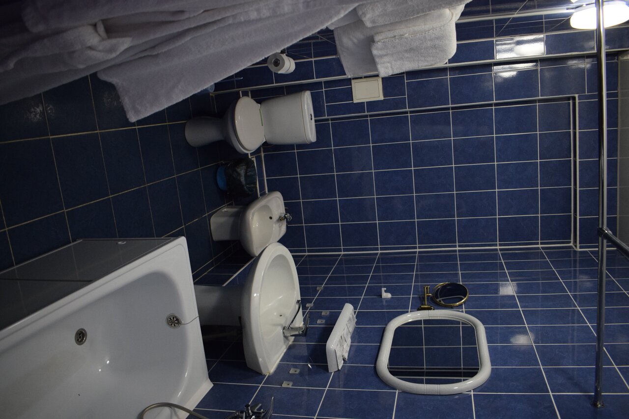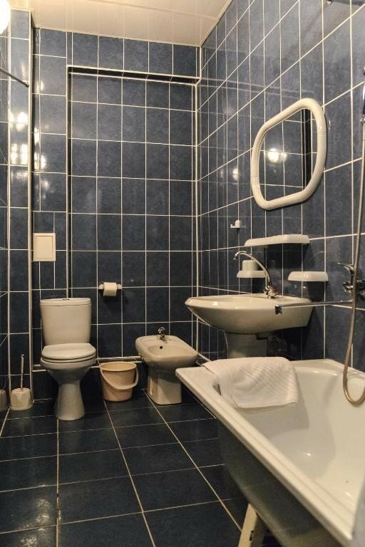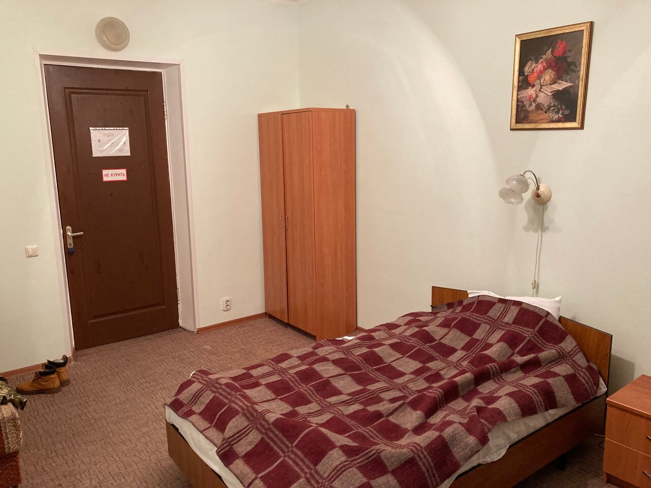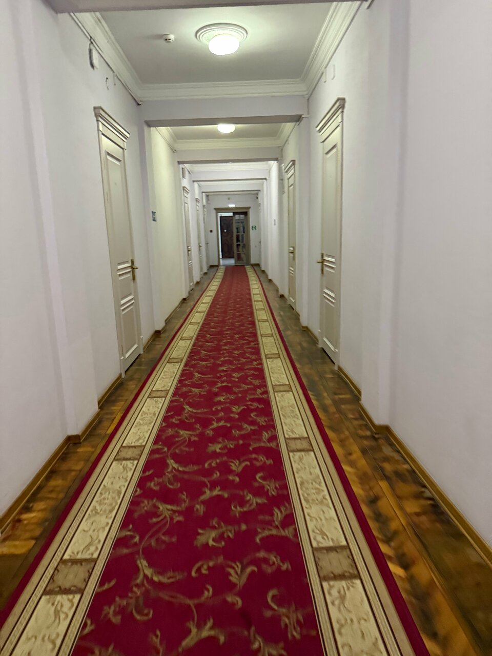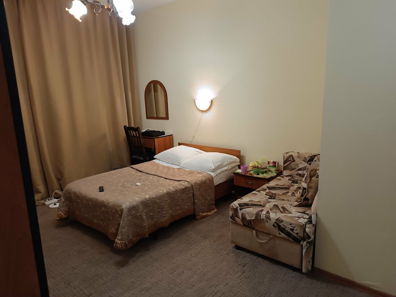 Немного отреставрированная советская гостиница. Есть конечно определённый шарм в этом, но если не на долго. В номере прохладно было, не критично, по спал под одеялом и пледом. Из явных неприятных моментов- вода очень неприятно пахнет, та что из крана в ванной комнате, аэраторов нет, поэтому первый пуск воды в раковине — брызги во все стороны. У меня в номере в сливе в ванной были волосы не убраны. Держатель шторки — ржавый.