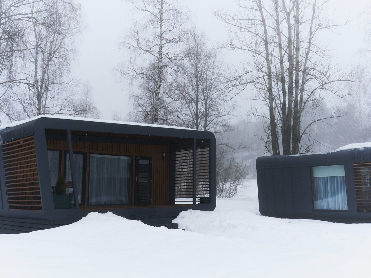 Современный модульный дом из качественных инновационных материалов.Комфортная вместимость – 2 человека (до 3 человек)Панорамные окна, большая двуспальная кровать, прикроватные тумбы, светильники, телевизор, функциональная кухня с холодильником, ...