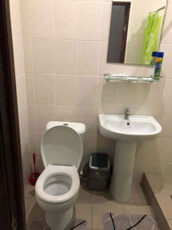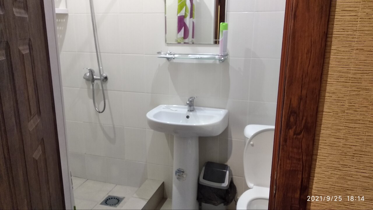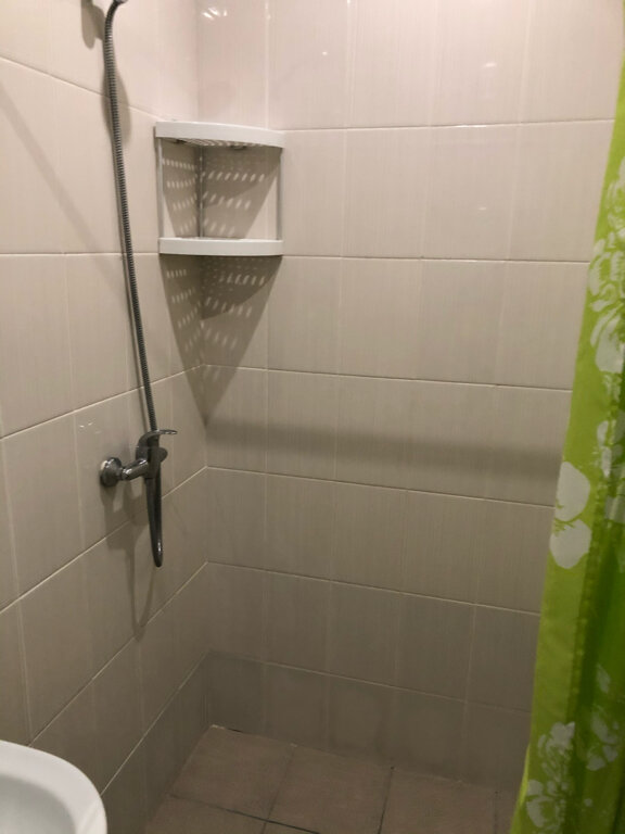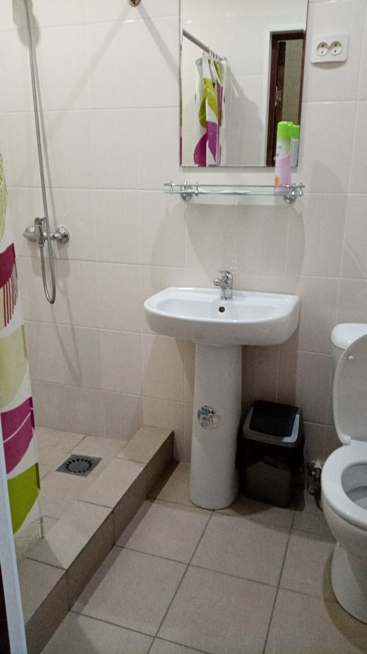 Общий санузел и душ. В комнате от жары запах пластика и линолеума.