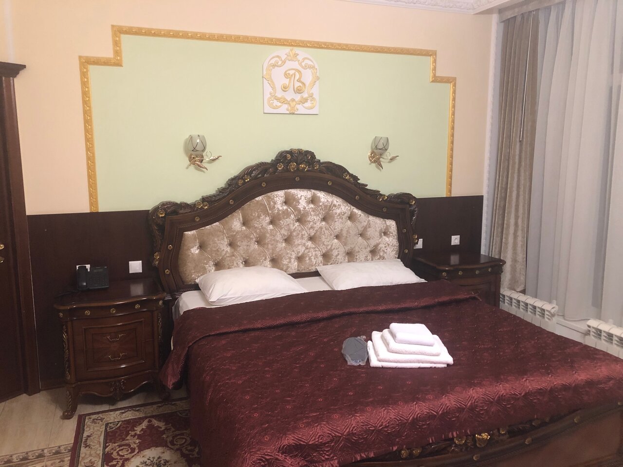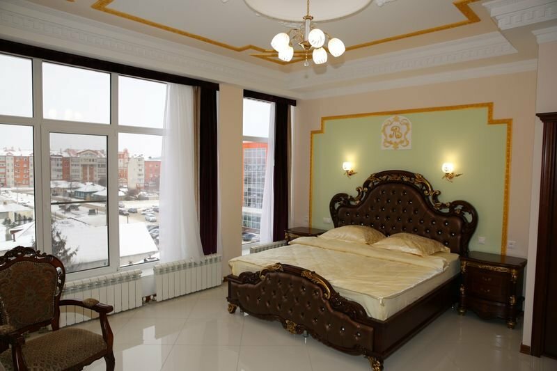 Самое странное заведение из всех, где мне приходилось бывать. В ничем не примечательном доме из серого кирпича внезапно обнаруживается дворец Марии-Антуанетты. Совершенно роскошный на первый взгляд интерьер, при ближайшем рассмотрении оказывается больной фантазией провинциальной куртизанки — кровать на львиных лапах из ДСП, каретная стяжка на изысканном полиэстере, закреплённая стразами из ослепительного пластика. Очень просторные номера, высокие потолки, большой санузел. Сотрудницы рецепции дружелюбны и вежливы. При выборе номера имейте ввиду, что лифта в гостинице нет, а высота лестничных пролётов весьма приличная. Все этажи гостиницы опоясаны балконом. Город невысок и уже с третьего этажа открывается великолепный вид. В целом впечатления самые позитивные. А странный интерьер — дополнительный повод для веселья и забавных постов в соцсетях. 😉