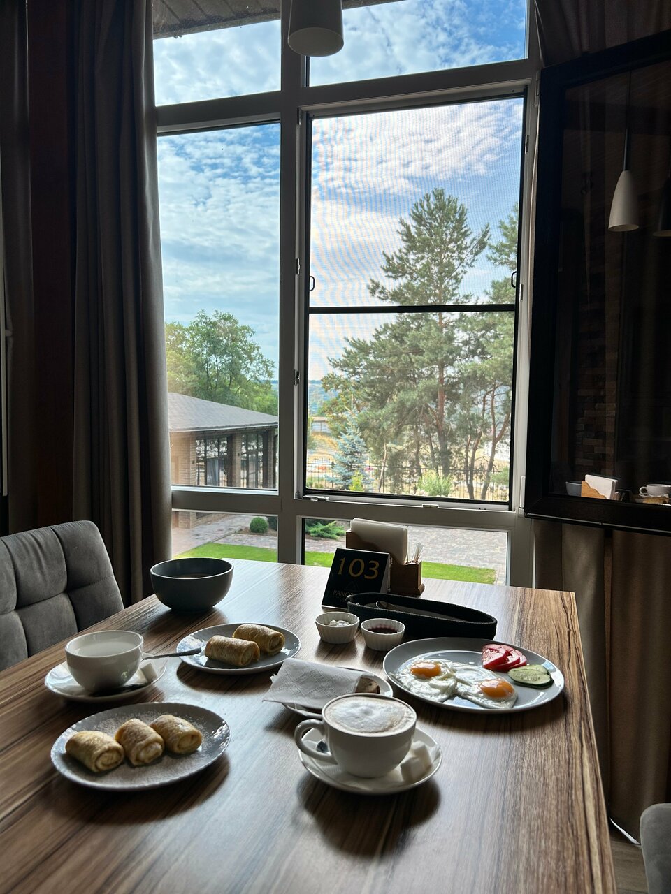 Очень стильно! Вежливый и отзывчивый персонал! Чистый номер. Панорамное окно. Фен, тапки, холодильник, чайник и тв. Вода и чай — все включено! Красивые и вкусные завтраки! Ухоженная прилегающая территория и ее ландшафтный дизайн гармонично вписывается в дальнейшую парковую зону.