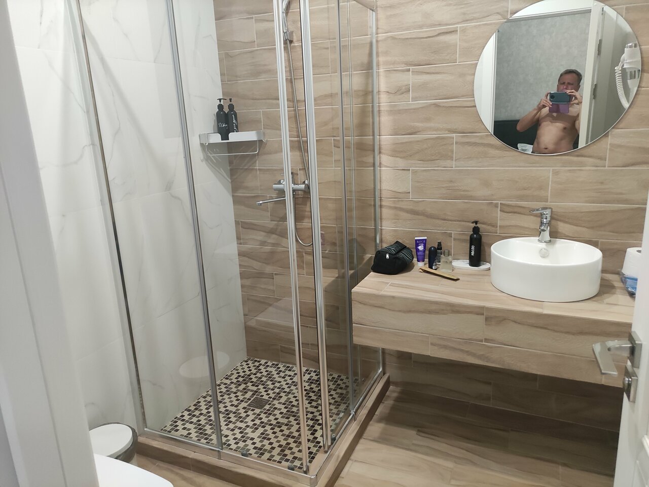 Не удобный фен. Держатель душа фиксирован, нет возможности скорректировать направление и вода бьёт в стену над головой на высоте примерно 2 метров. Мыться очень не удобно. Халат отсутствует. Тапочки ужасные. Зубного набора, шапочки для душа, косметического еабора нет. Плечики в шкафу все разные и хлипкие. Вешалка для верхней одежды не предусмотрена. Ужин фиксированный, без выбора, что сготовили, то и еште. Бывает вчерашнее. Постельное белье хорошее, кровать удобная.