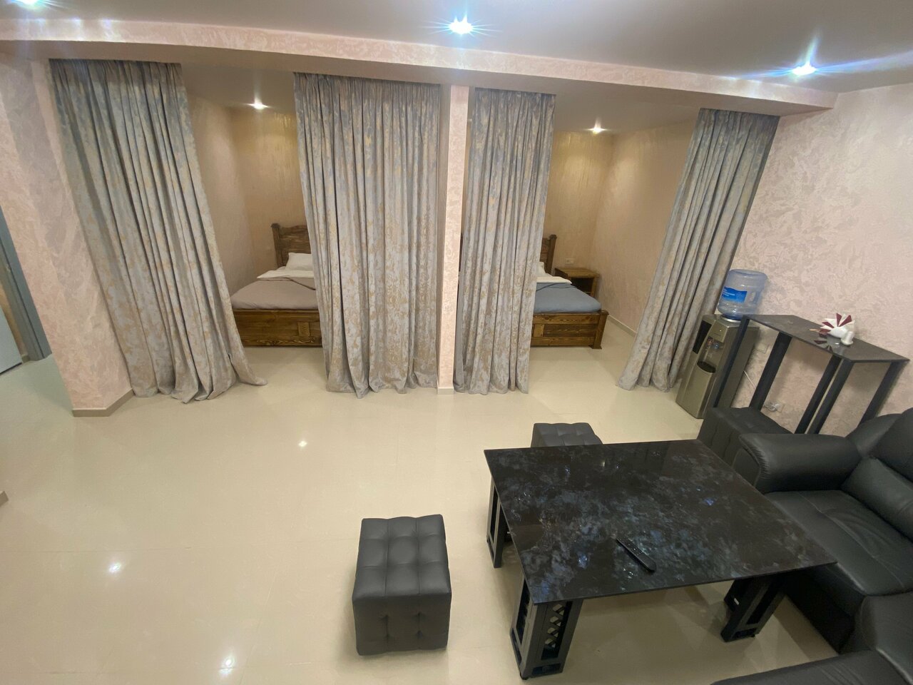 - Быстрая и удобная бронь с предоплатой.; Дополнительные услуги (сауна, бассейн).; Наличие необходимых средств гигиены (зубные щётки, шампунь, гель).; Чистый номер с хорошим ремонтом и удобным матрасом.; Уютная зона отдыха внизу (столики).