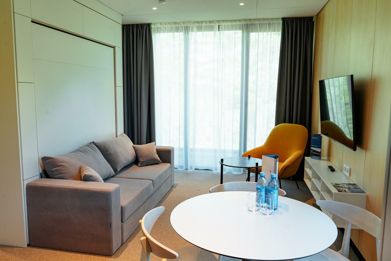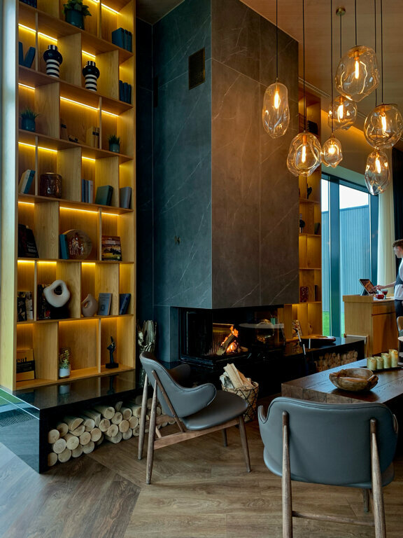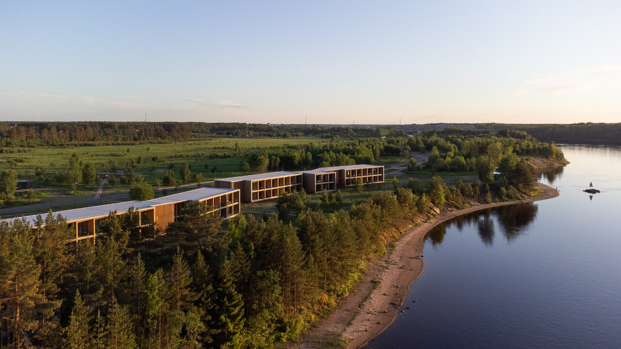 - Дружелюбный и внимательный персонал.; Хороший дизайн отеля.; Наличие балконов с видом на реку.; Детские удобства (тапочки, наборы для купания).; Красивое расположение (лес, река, берег).