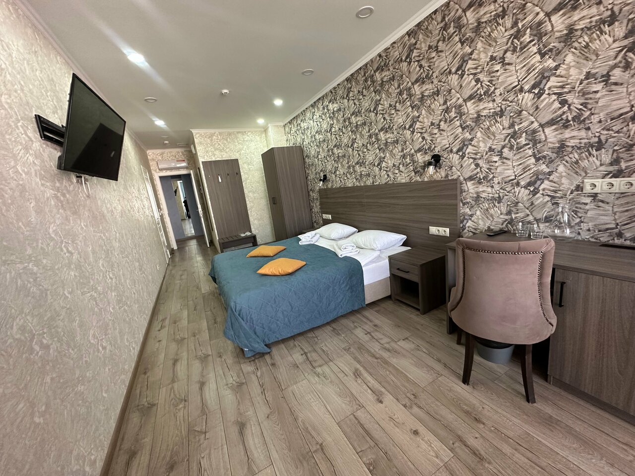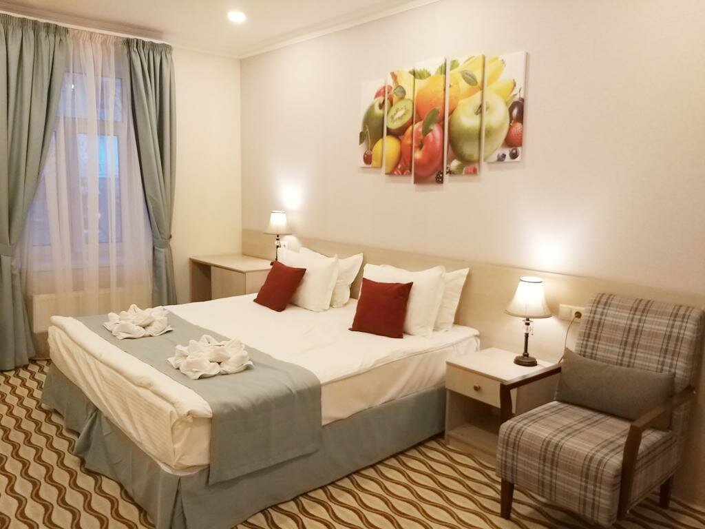 Номер категории 'Стандарт' имеет площадь 18 кв.м.Номер оснащен удобной двуспальной кроватью-трансформером (одна большая кровать ) с высоким ортопедическим матрасом, прикроватными тумбочками со светильниками, удобным креслом, шкафом для одежды, ...