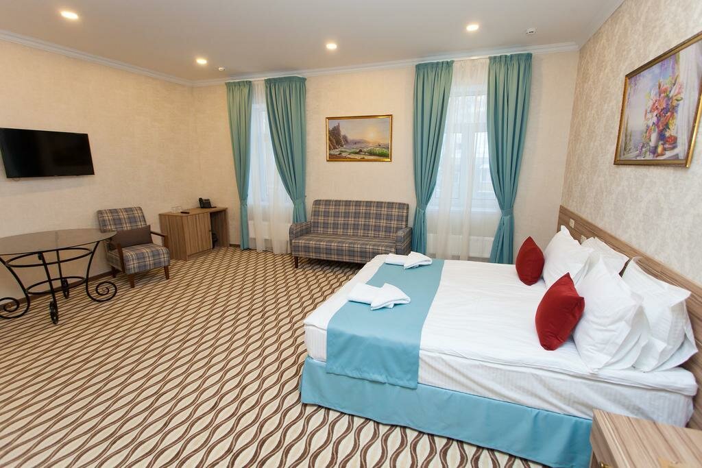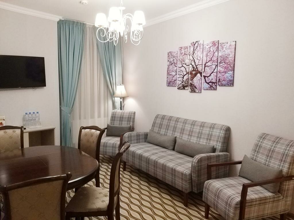 Номер улучшенный deluxe со всеми удобствами, кровать king-size или 2 отдельные кровати, гостинная зона. Халаты, тапочки, косметические принадлежности.