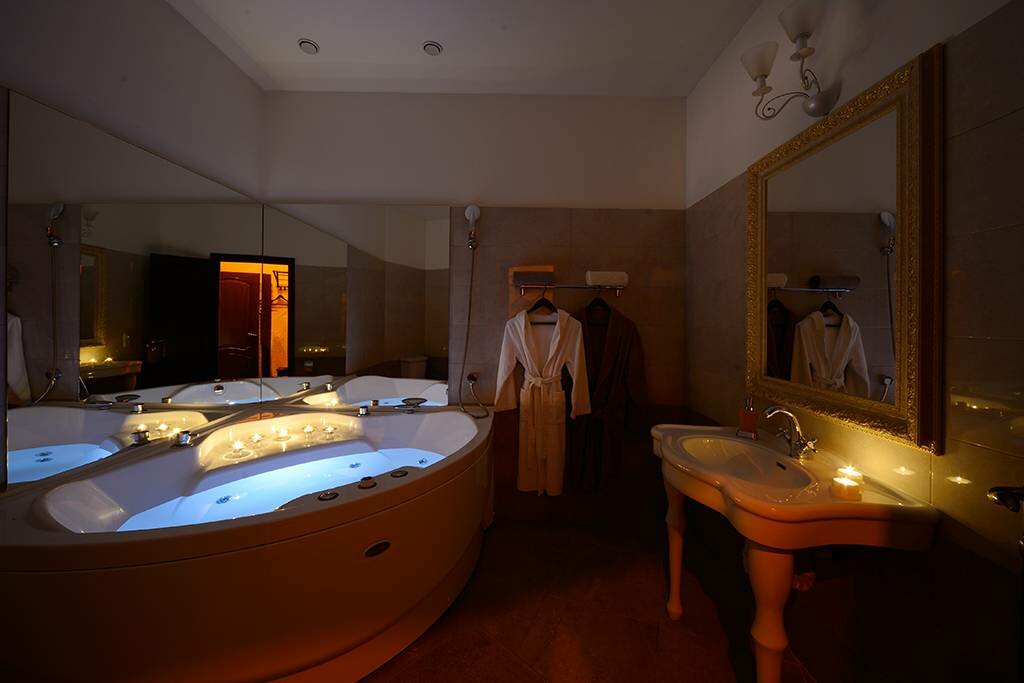 - Наличие джакузи в номерах.; Предоставление дополнительных услуг (колонка, шампанское).; Уютная и комфортная атмосфера.; Ванные комнаты большие и удобные.; Доступные цены (соотношение цена-качество).