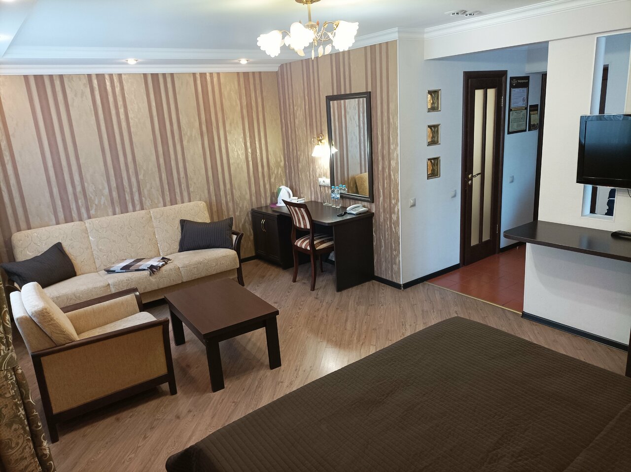 Номер просторный, рядом есть все необходимое, персонал приветливый, но в номере пыльно, мебель потрепаная, холодильник работает очень шумно, на кровати спать невозможно, еда в кафе оставляет желать лучшего.