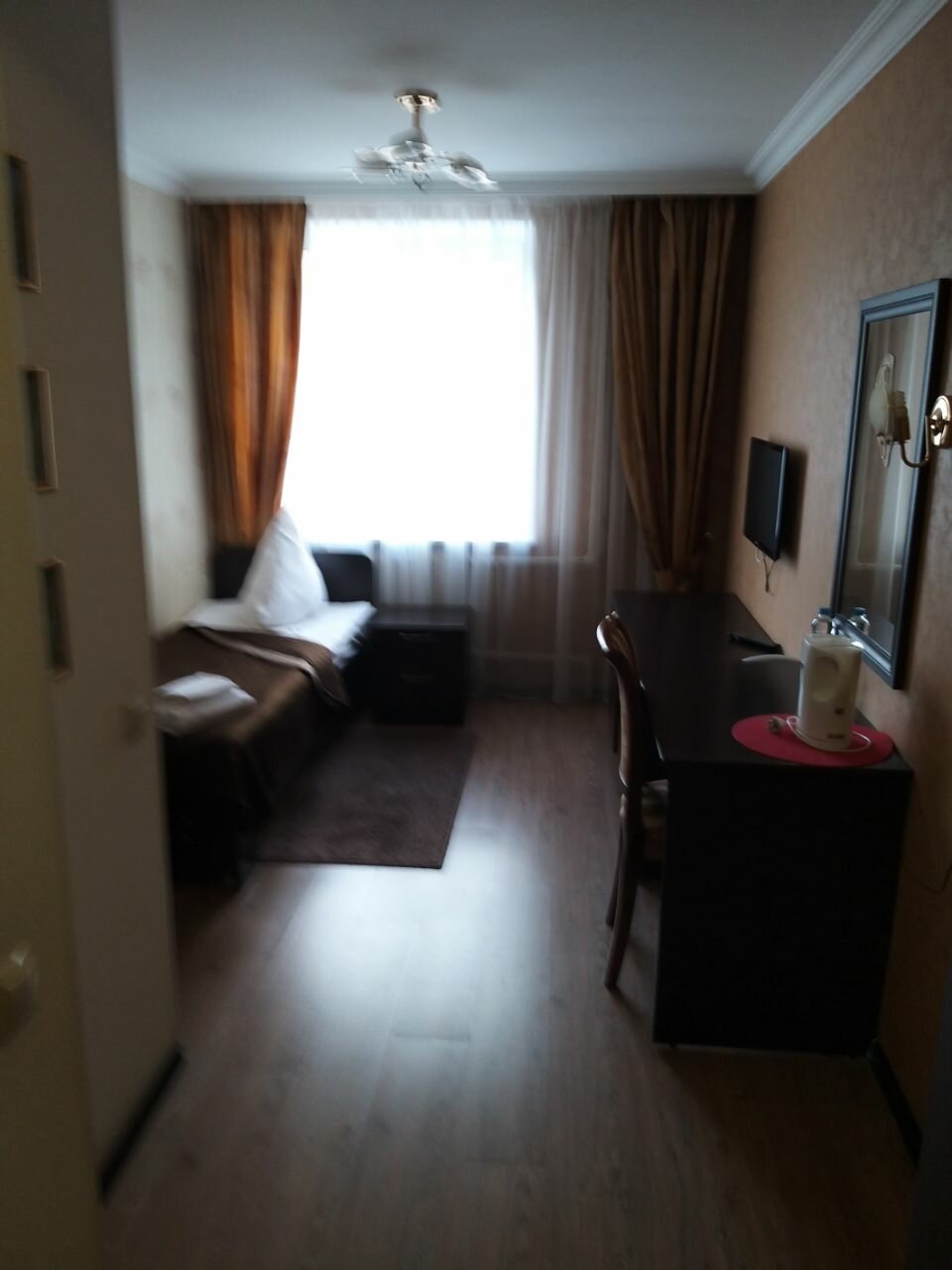 В номере летом жарко, окно выходит на дорогу, если открыть очень шумно от машин, если закрыть будешь мокрым от пота. Кондиционера в номере нет. И отдельная тема это телевизор. Изображение мезопакостное, хотя ТВ samsung, денег не пожалели. В гостиничном кафе изображение прекрасное, а вот для номеров такого сделать нет никаких сил. Показываь такую картинку своим , якобы уважаемым клиентам, в наше время просто стыдно.