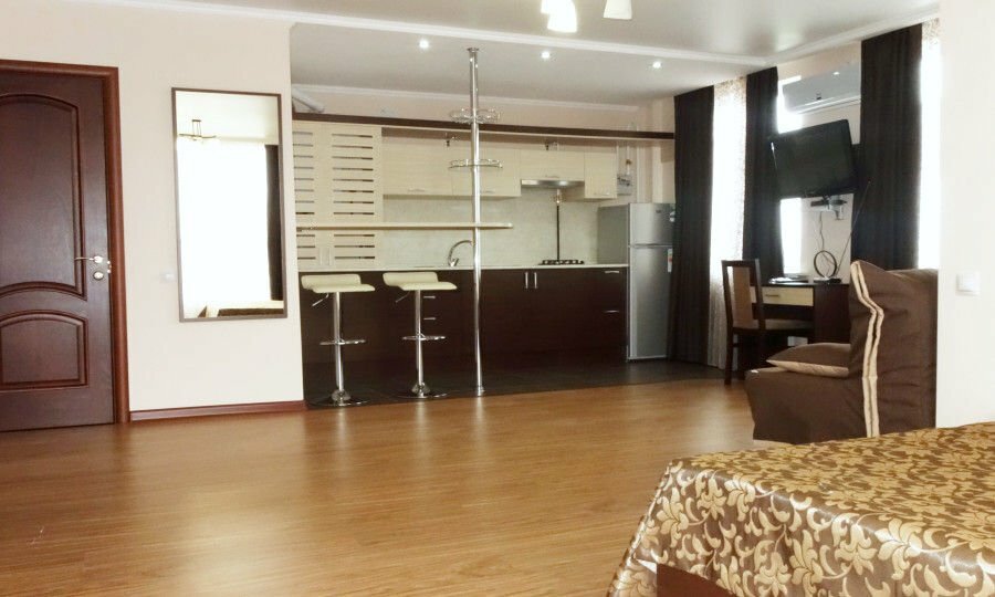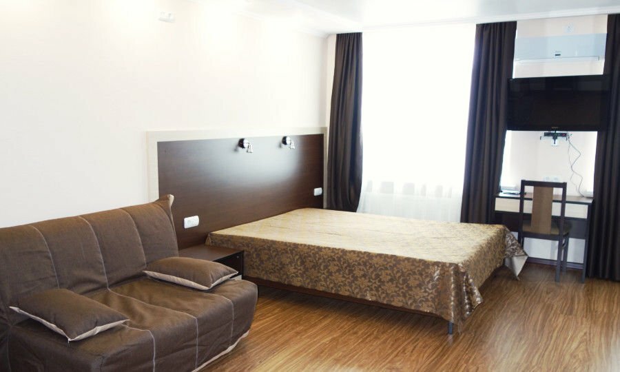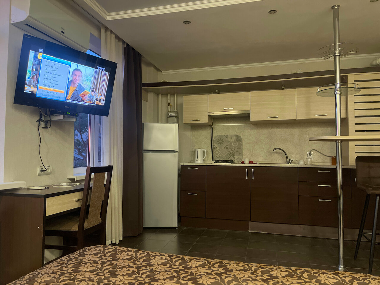 Отель неплохой, уютный,интересный, вроде и номер большой, мы с мужем брали номер Студия, були проездом. И чисто тоже, но, есть мелочи, которые как-то снижают уровень… Из минусов: вода еле еле напор, унитаз вода постоянно течёт, туалетная бумаги был буквально маленький остаток, не хватит даже на одного человека, но мы всегда берём с собой) подушки нуждаются в замене.. Не имеется мыльных принадлежностей, зубных щёток. Нет тапочек и халатов. Администратор приветливый и вежливая. Также в номере есть плита, но если вы едете на долго, то утвари нет. Чайник есть.