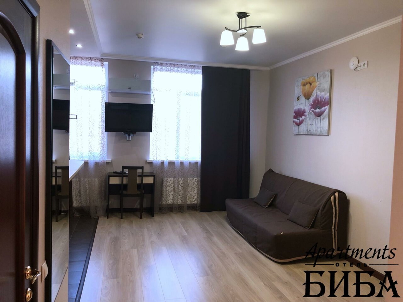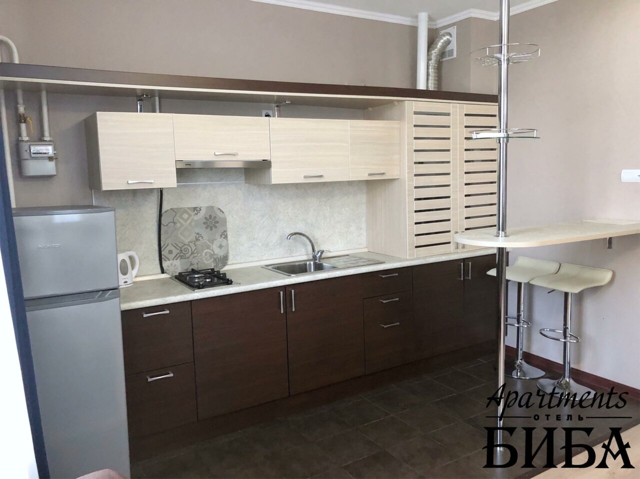 По стечению обстоятельств необходимо было разместить мою маму в городе Майкоп. Искали различные варианты (посуточная и долгосрочная аренда квартир, другие гостиницы). По рекомендации остановились в Биба Апартментс. Отличное соотношение цены и уровня комфорта. В номере есть все необходимое (душ, туалет, кровати и диван, ТВ, полноценная кухня с варочной поверхностью, холодильником и т. д.). Все очень удобно и аккуратно. Очень вежливо встретили, пошли на встречу и засели даже немножко раньше обозначенного срока. Спасибо всем сотрудникам за ответственный подход к работе. Гостиницу однозначно рекомендую.