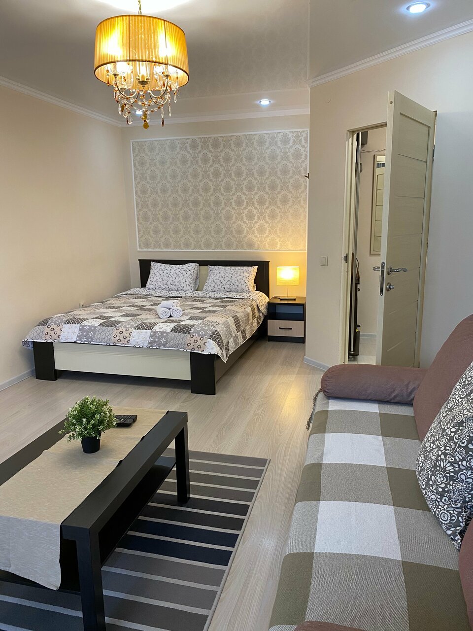 Квартира расположена в новом доме, чистая, уютная. Есть всё необходимое для приготовления еды — плита,посуда,чайник,микроволновка. Для трёх взрослых ростом 170-175 кровати комфортные, бельё чистое,матрасы и подушки удобные. Можно постирать бельё,есть стиралка и сушка для белья, утюг. Всё есть для комфортного отдыха, в том числе кондиционеры, телевизор. Фото соответствуют реальности. Рекомендую #bibars_aparts