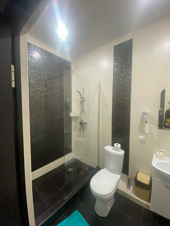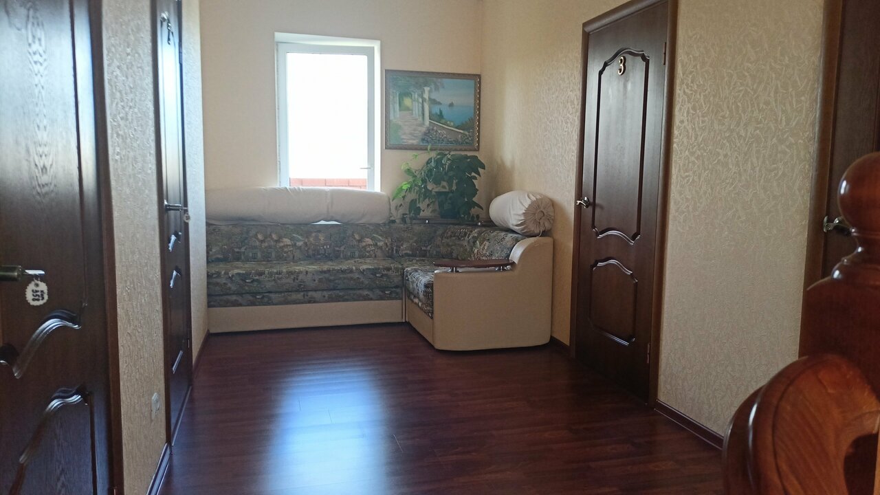 В гостевом доме чисто, можно ходить босиком. Это двухэтажный дом. На первом туалет, ванная и совмещенный туалет с душевой кабиной и кухня. На втором 4 комнаты. У нас был телевизор, кондиционер, шкаф, комод, тумбочки, графин с водой и стаканы. В кухне микроволновка, чайник, сахар, чай, кофемашина и капсульная тоже была, холодильник, посуда и все необходимое. Расположен не в центре. на машине не более7 минут. Такси стоило 130 рублей. Хозяин доброжелателен, все расскажет, не навязчивый. Такое ощущение, что жили в своём доме) нам все понравилось