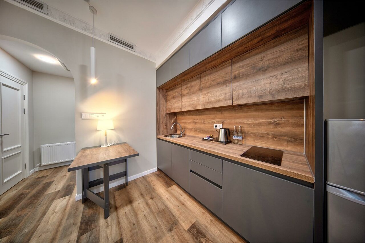 - Хорошее месторасположение (центр города).; Наличие воды, чая, кофе в номере.; Стильный и минималистичный интерьер.; Вежливый и доброжелательный персонал.; Полностью оборудованная мини-кухня в номерах.