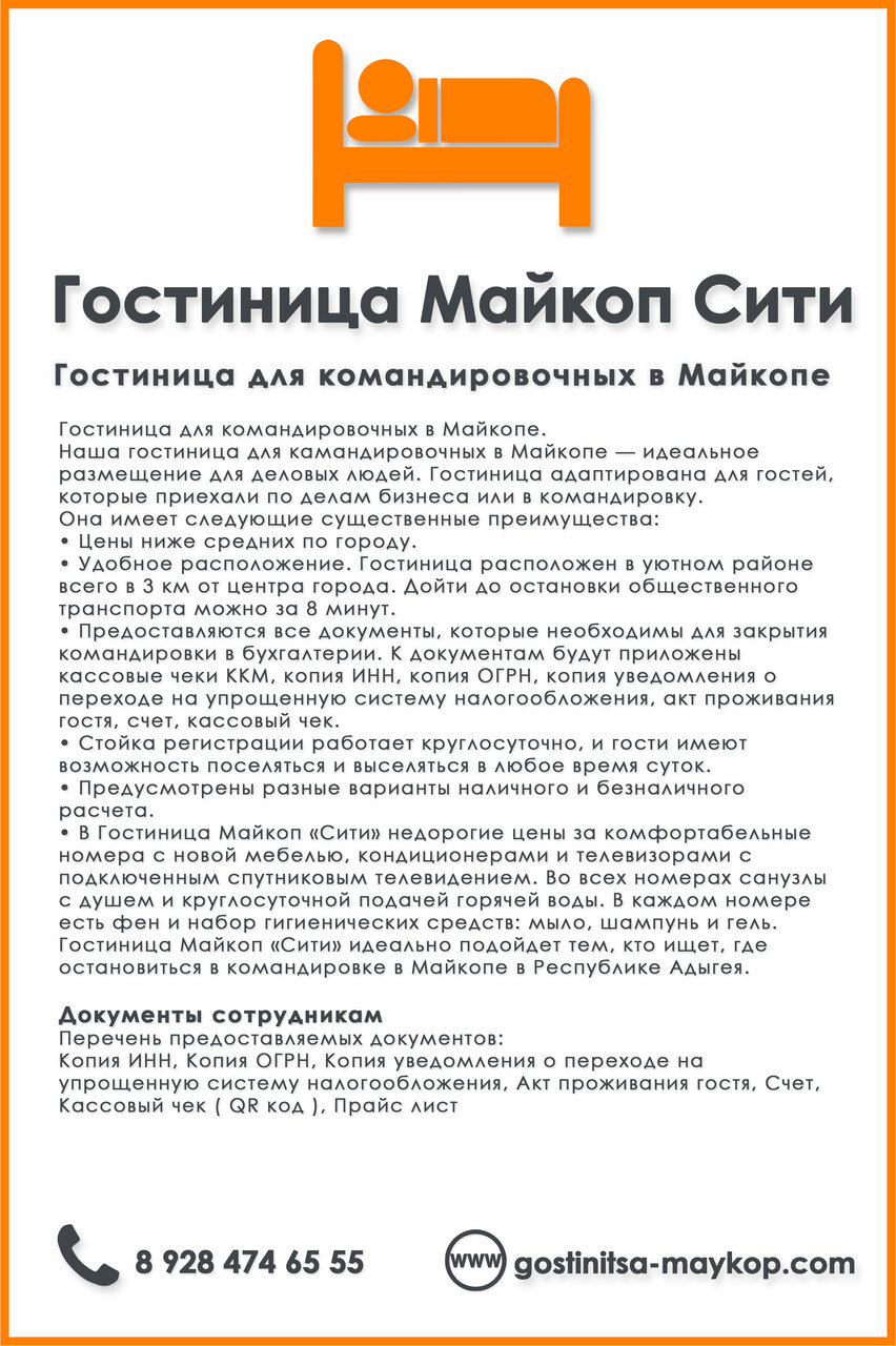 Подходит для командированных, туристов и семей с детьми. Контакты: +7 (928) 474-65-55, сайт: gostinitsa-maykop.com. Дата постройки: 2015. Время заезда — 13:00, выезда — 11:00.