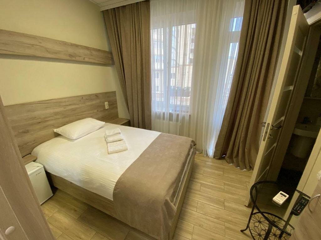 Гостиница в центре города, номер современный, чистый, но малюсенький. Санузел так же тесный. Зато цена завышена. Кафе на первом этаже, как бы завтрак включён. Но мы уезжали в 7 утра и нам сказали, что рано слишком, не положено. Хотя в таких случаях хорошие гостиницы дают сухпаек в дорогу, ведь оплачено все. Осталось ощущение, что просто пользуются моментом. Вобщем, не рекомендую.