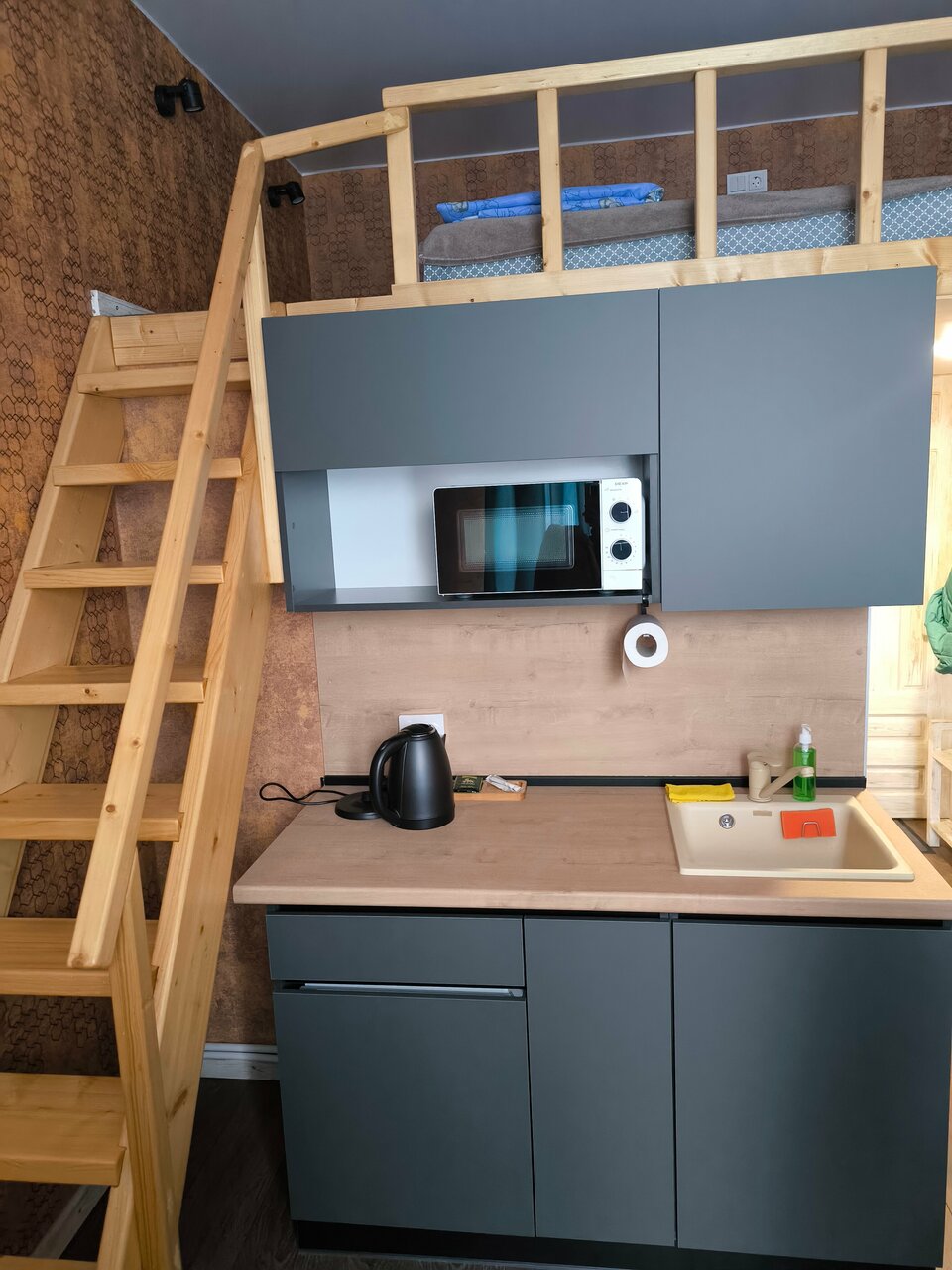 Оригинально, два уровня, спальное место на втором уровне, если вы со спортом норм, лесенка крутая, низкий потолок, действительно капсула получается. А в остальном уютно, чисто , завтраков нет.