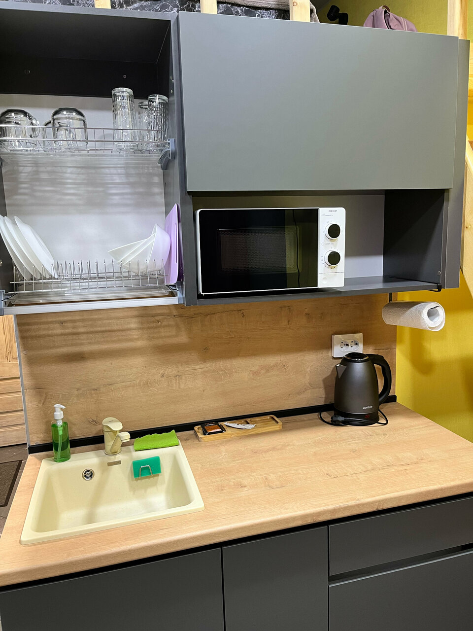 - Наличие кухни, чайника, микроволновки, посуды.