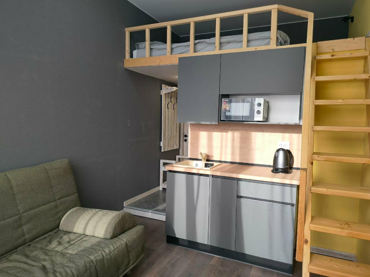 Свеженький отель с уютными номерами. В номере все удобства: туалет, душ, кухня с микроволновкой, холодильником и чайником. Приборы и посуда так же имеются. Современный телевизор и WiFi. Матрас на втором уровне и раскладной диван-книжка очень комфортные для сна. Белье и полотенца отличного качества. Много других приятных мелочей, типа, управление светом, чай и сахар, гостевой кулер на этаже. Звукоизоляции не уделили должного внимания. Двери без уплотнителей и тонкие стены.