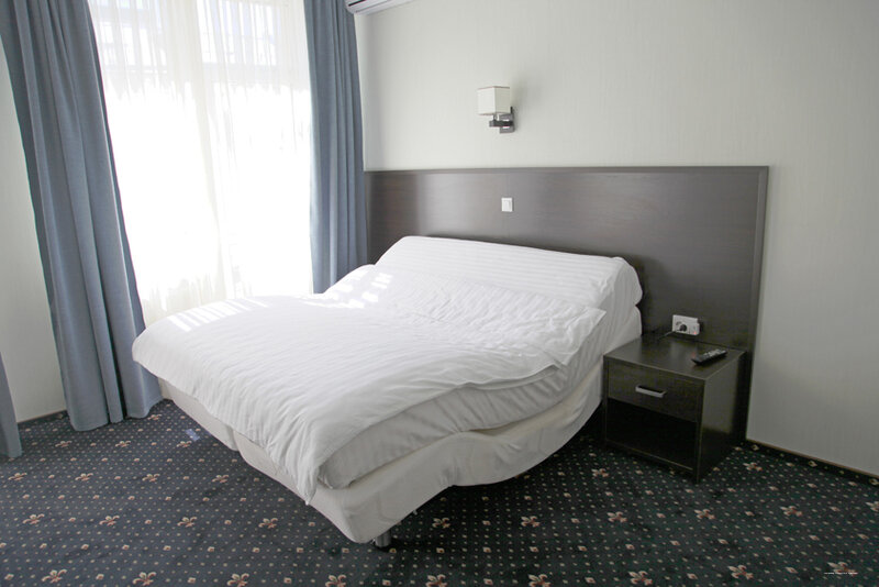 В номере одна большая двуспальная кровать, белое постельное белье, подушки, полотенца банные и для лица, плед, шкаф, комод, прикроватные тумбочки, холодильник , кондиционер , телевизор, фен, балкон со столиком и стулом , сушилка, сан узел и душ.