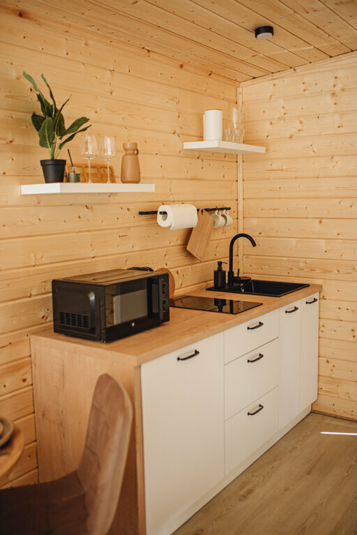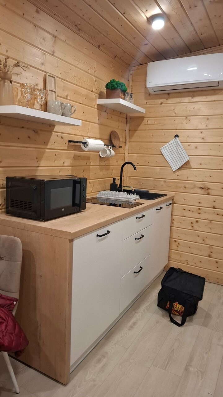 - Полная оснащенность домика (холодильник, микроволновка, плита, кухонные принадлежности).